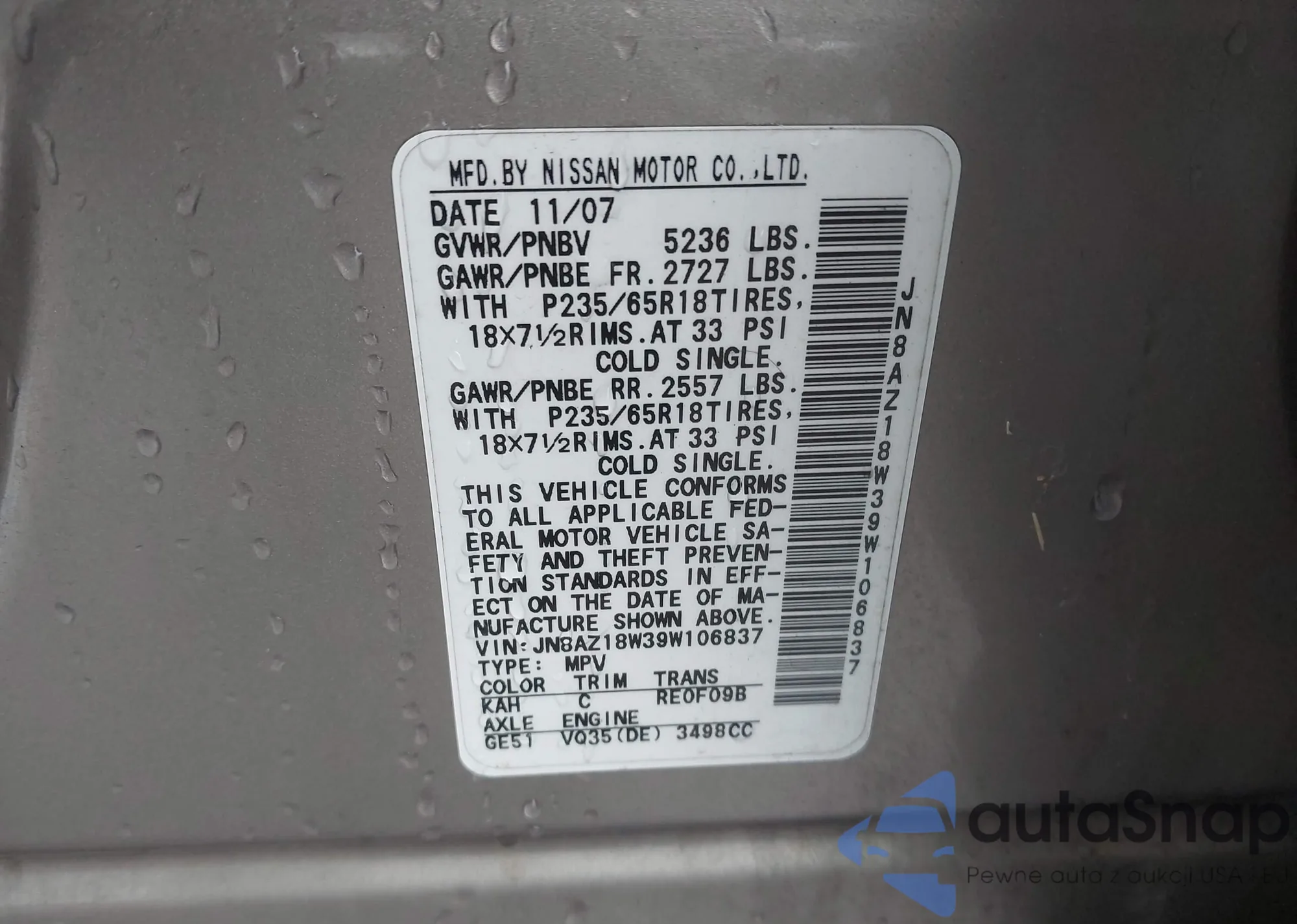 LOT: 44489503 VIN: JN8AZ18W39W106837