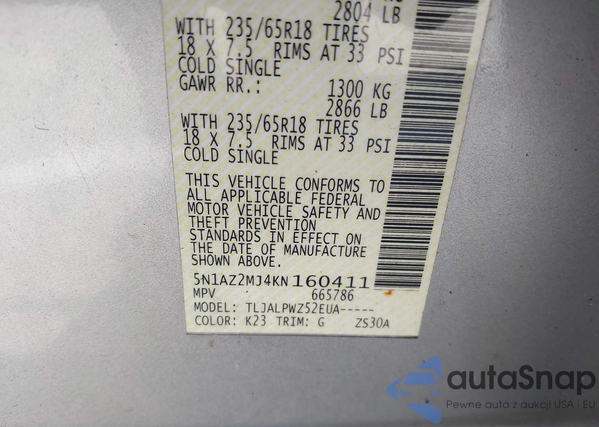 • VIN 5N1AZ2MJ4KN160411