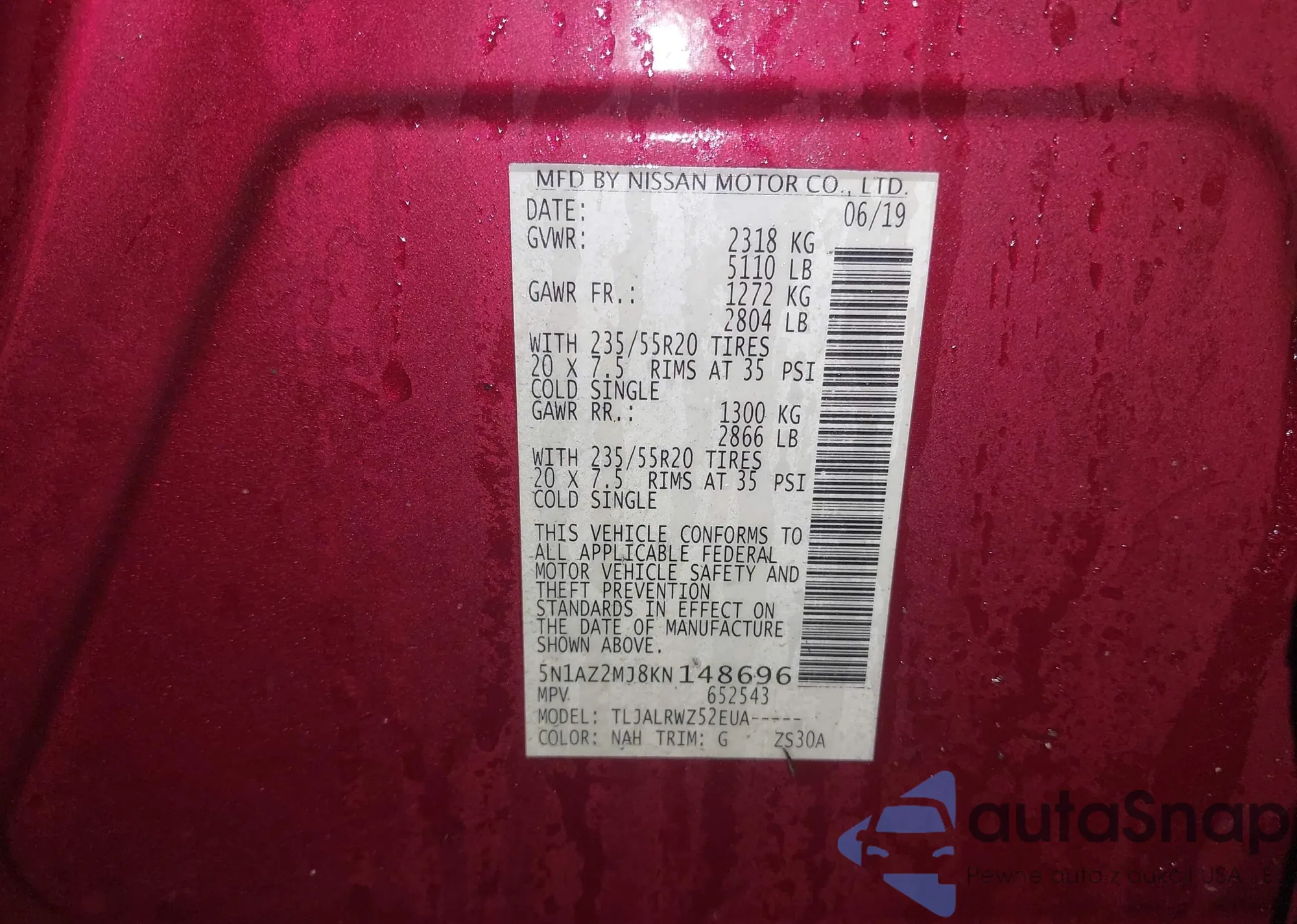 • VIN 5N1AZ2MJ8KN148696