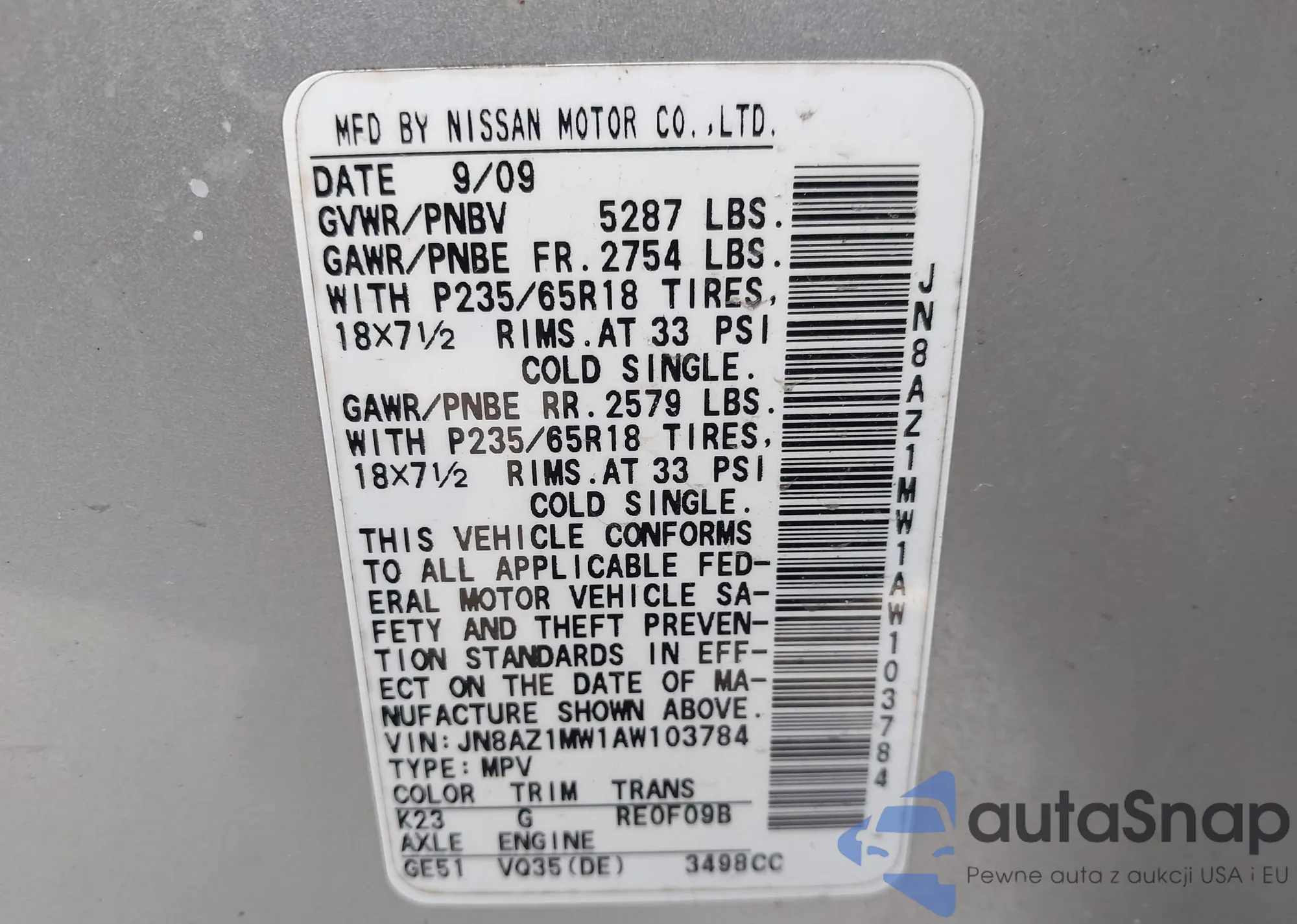 • VIN JN8AZ1MW9DW322819