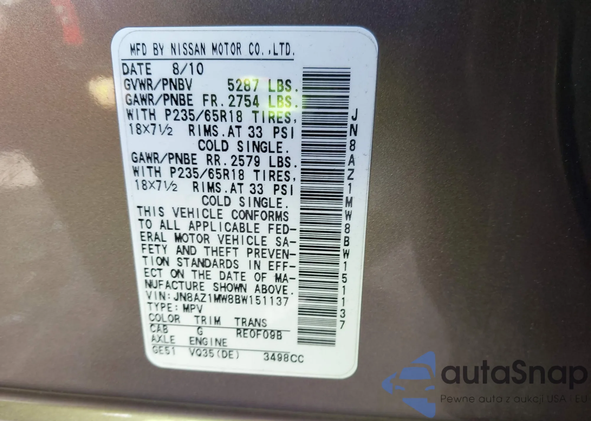 • VIN JN8AZ1MW8BW151137