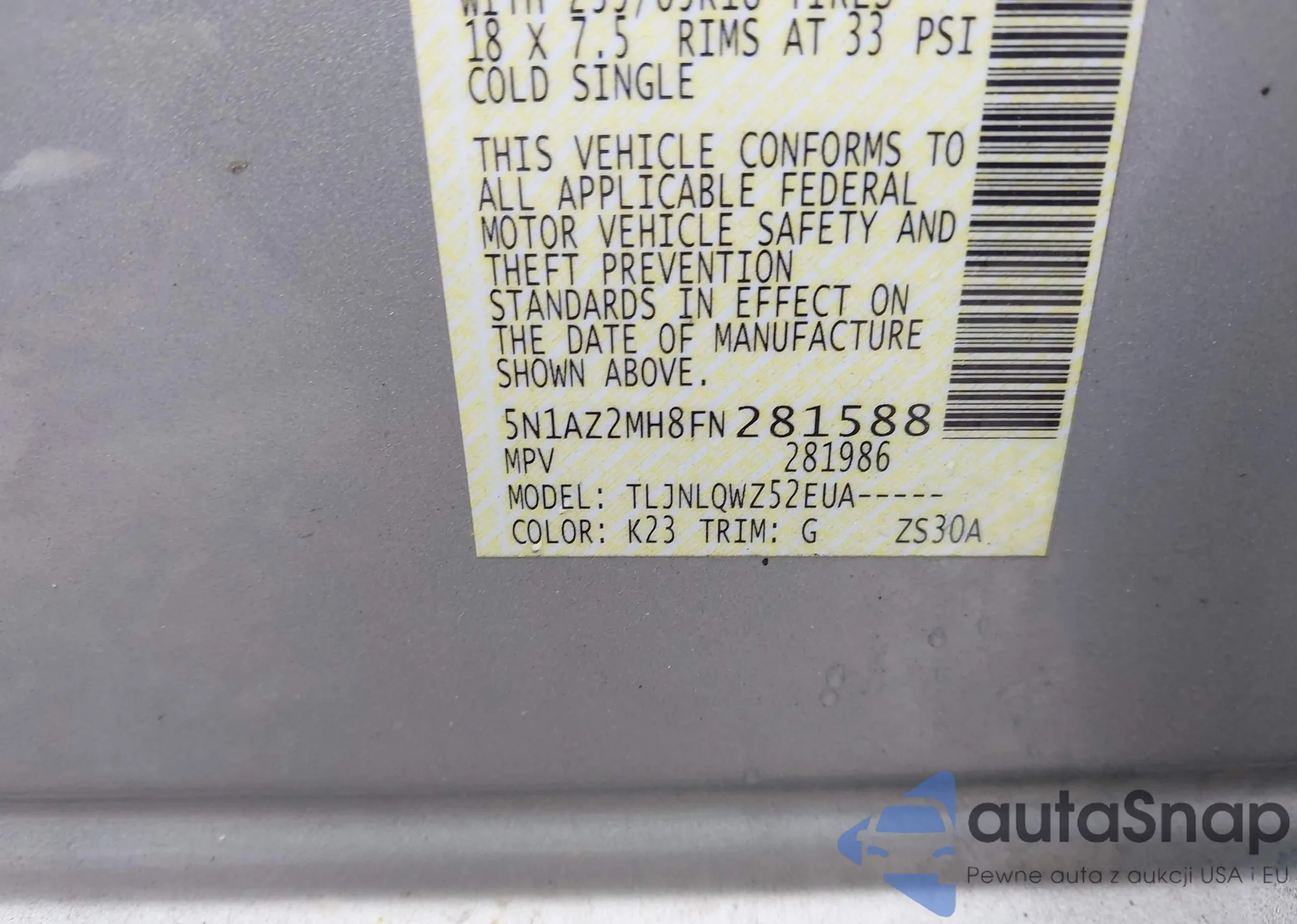 LOT: 43585038 VIN: 5N1AZ2MH8FN281588