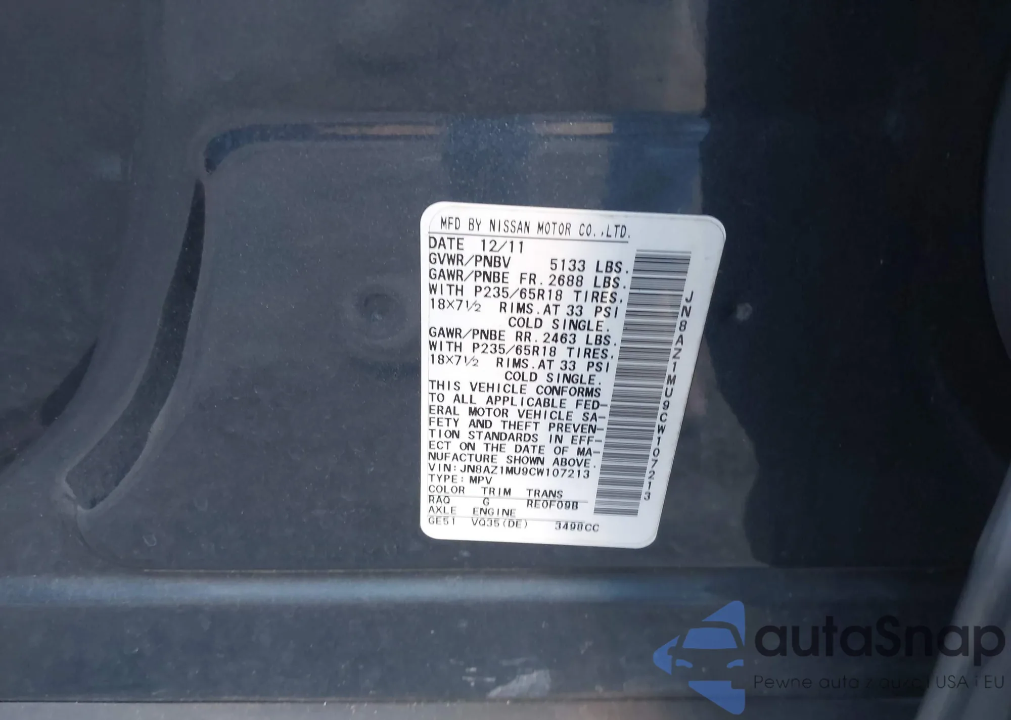 • VIN JN8AZ1MU9CW107213