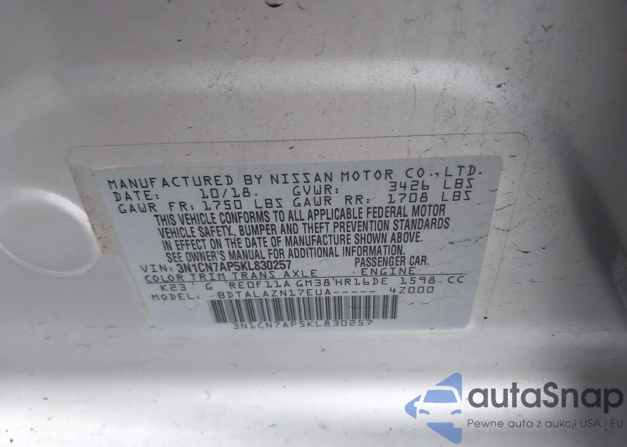 • VIN 3N1CN7AP5KL830257
