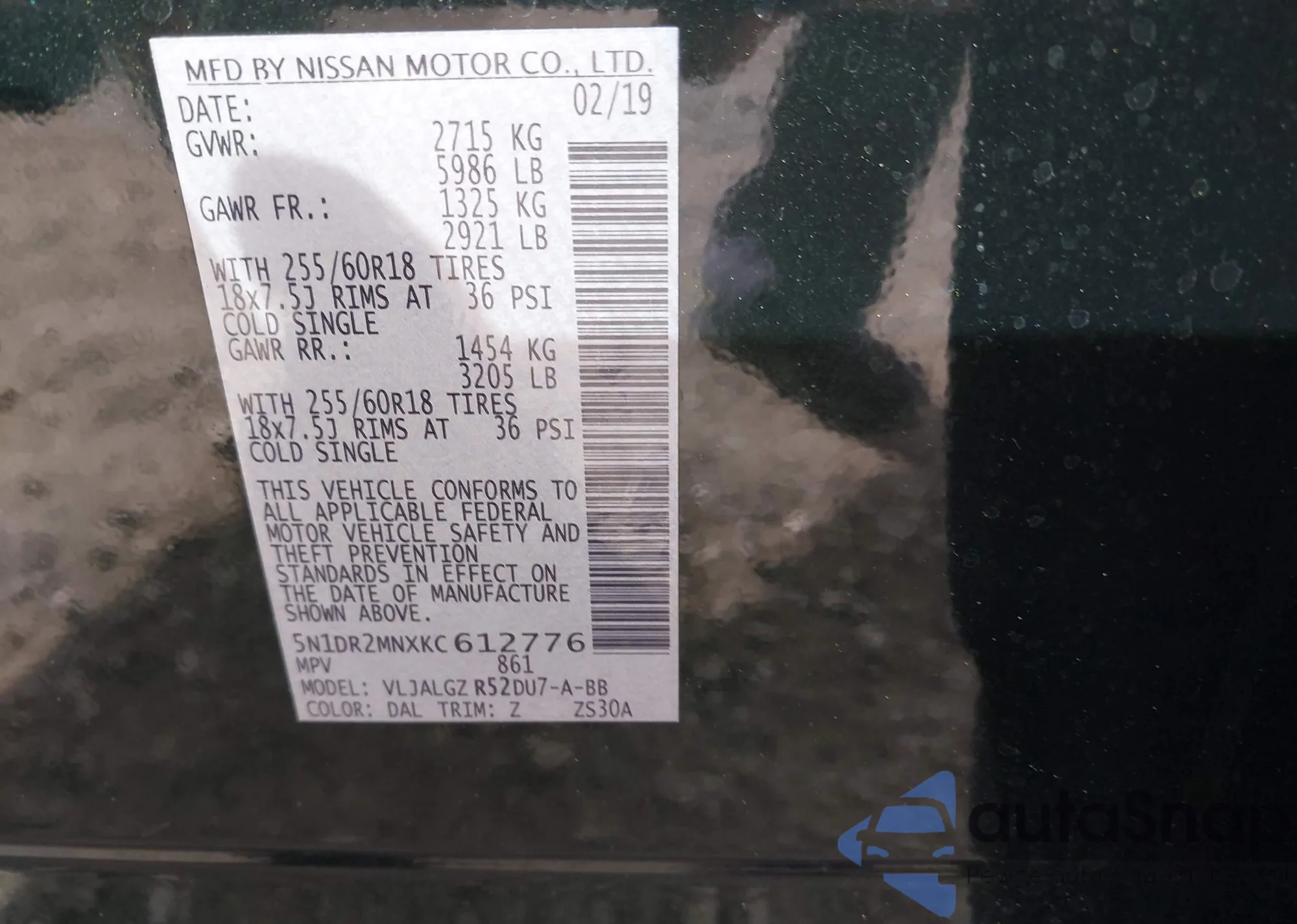 • VIN 5N1DR2MNXKC612776