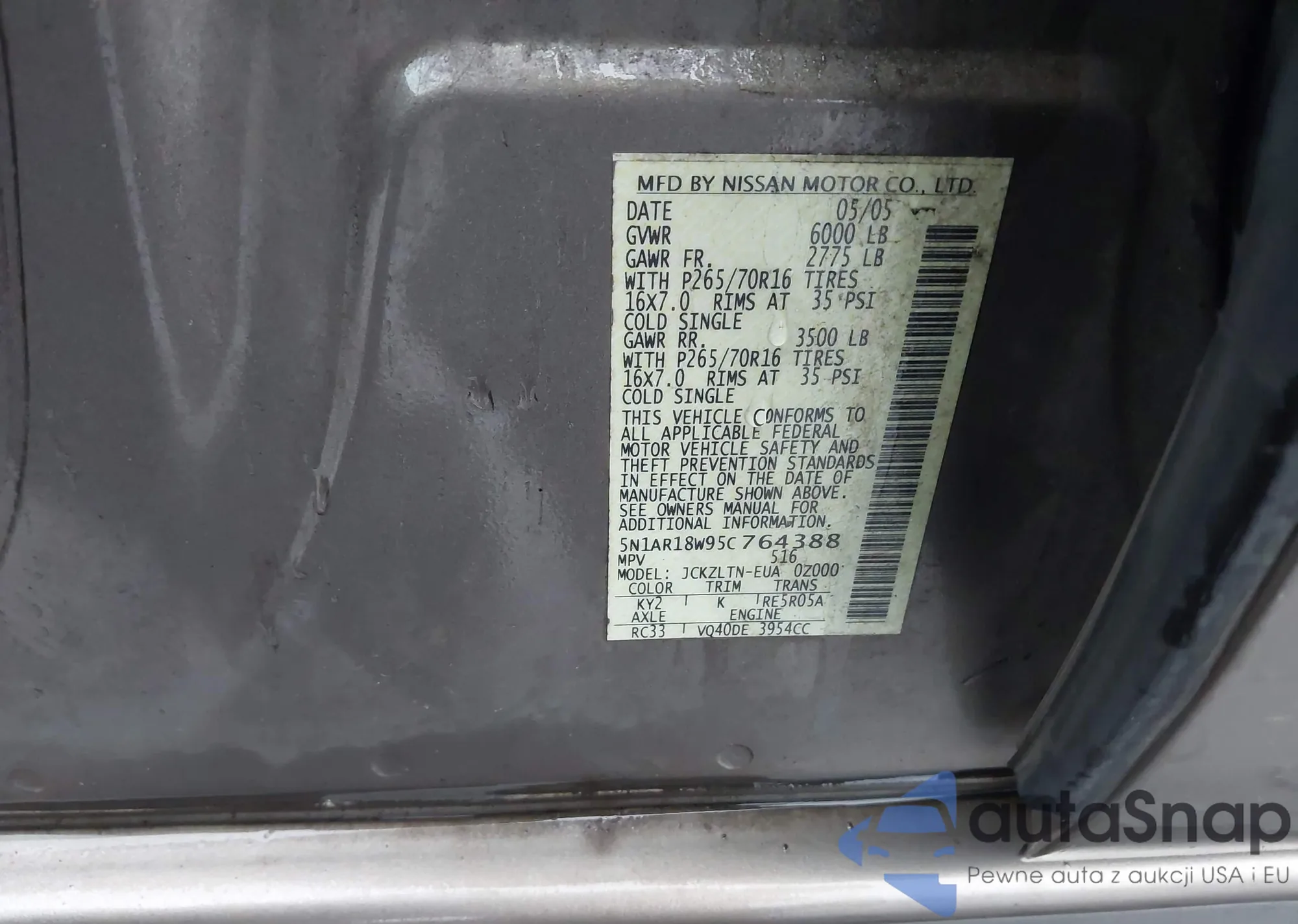 LOT: 44284772 VIN: 5N1AR18W95C764388