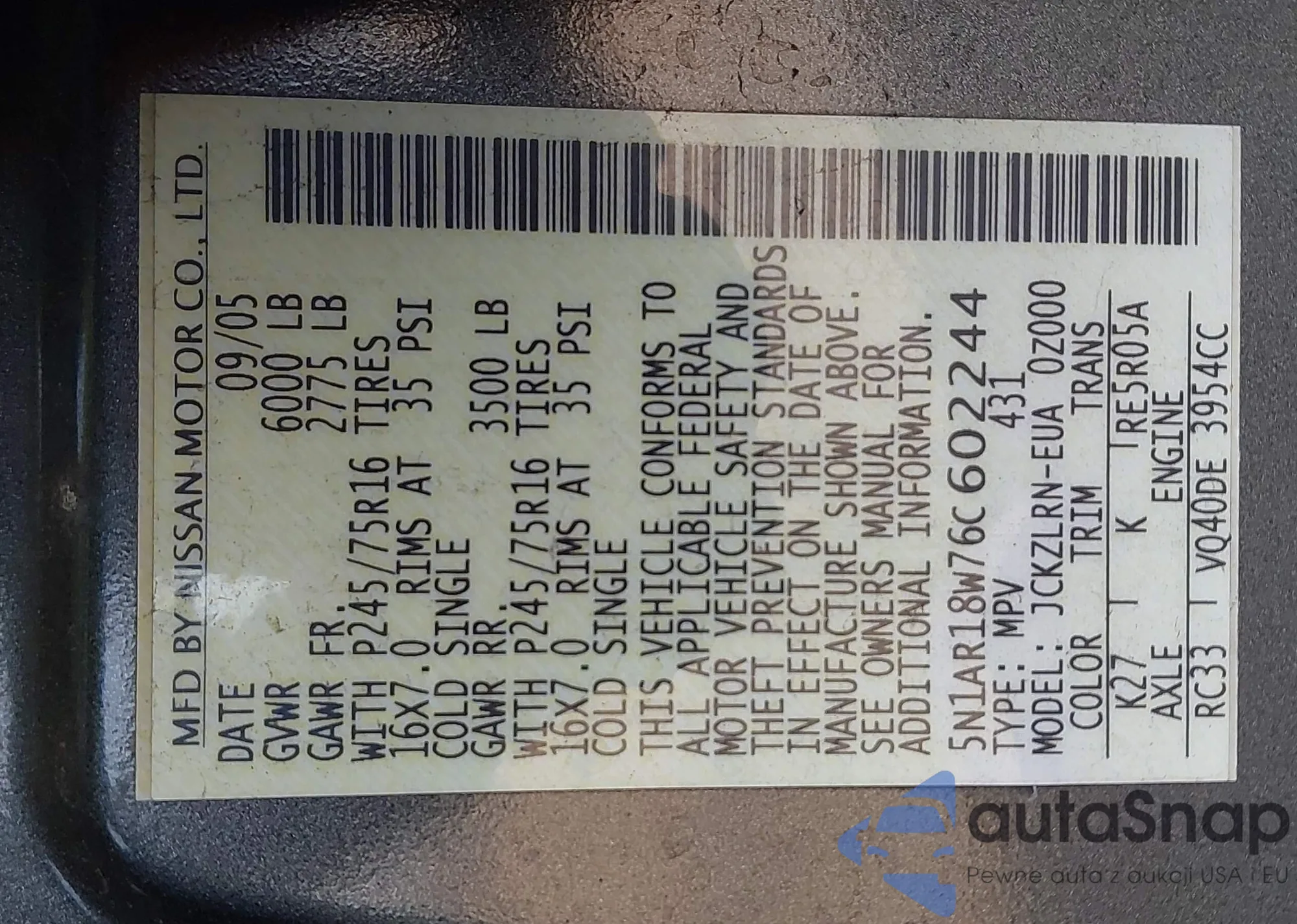• VIN 5N1AR18W76C602244