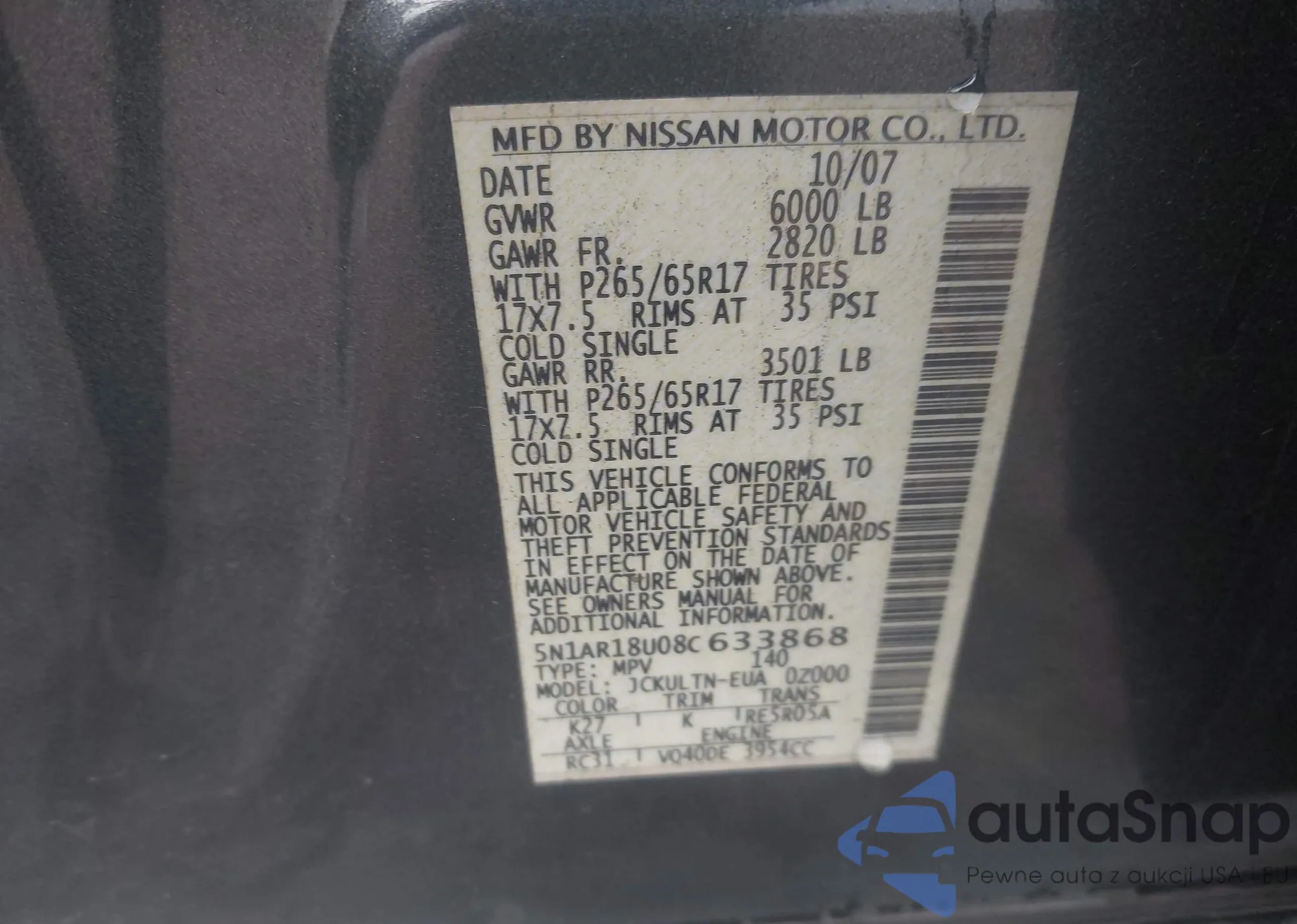 • VIN 5N1AR18U08C633868