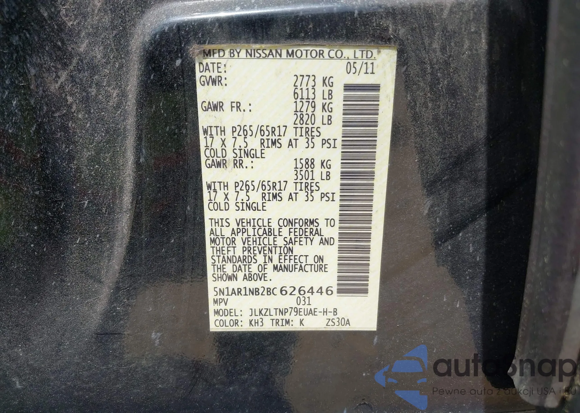 • VIN 5N1AR1NB2BC626446
