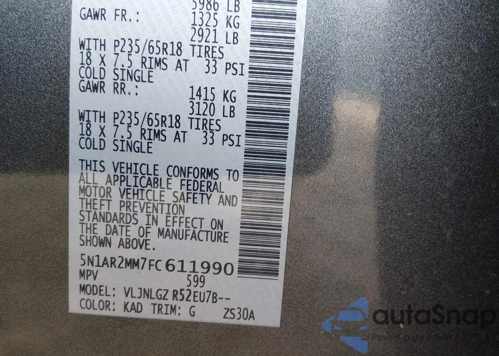 LOT: 94457495 VIN: 5N1AR2MM8FC637918