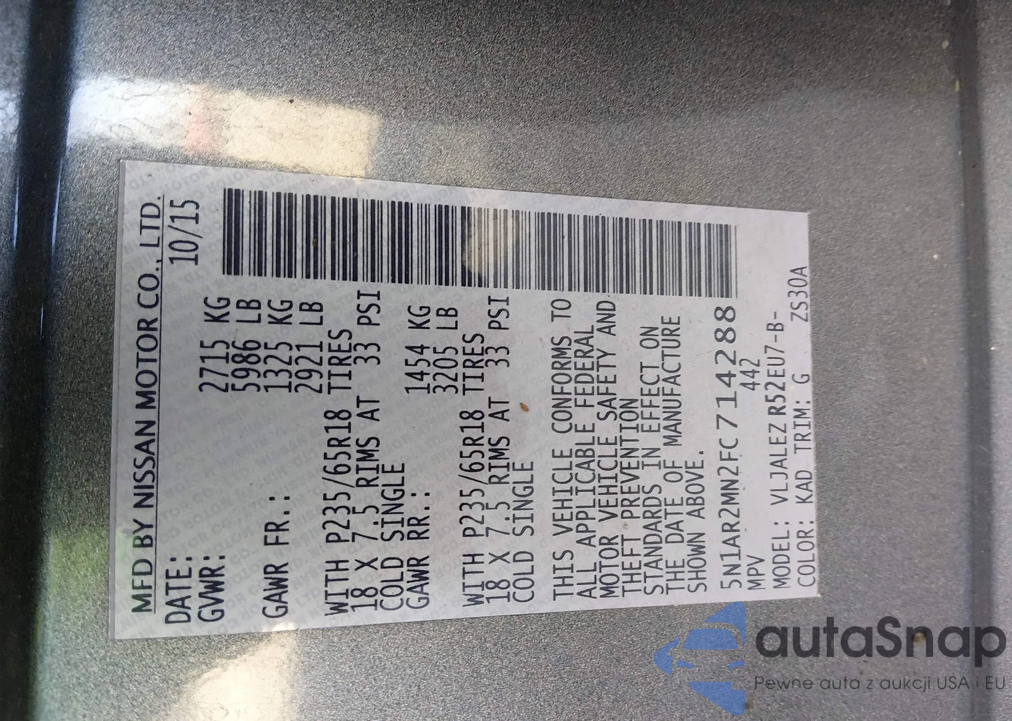 LOT: 50376455 VIN: 5N1AR2MNXFC604931