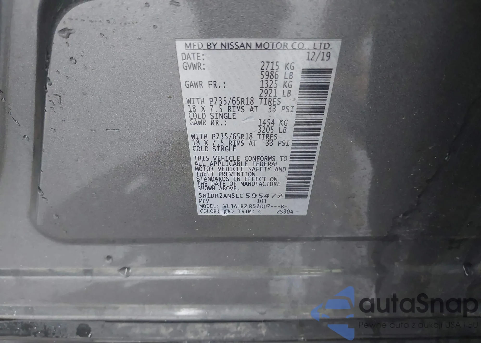 LOT: 43961187 VIN: 5N1DR2AN5LC595472