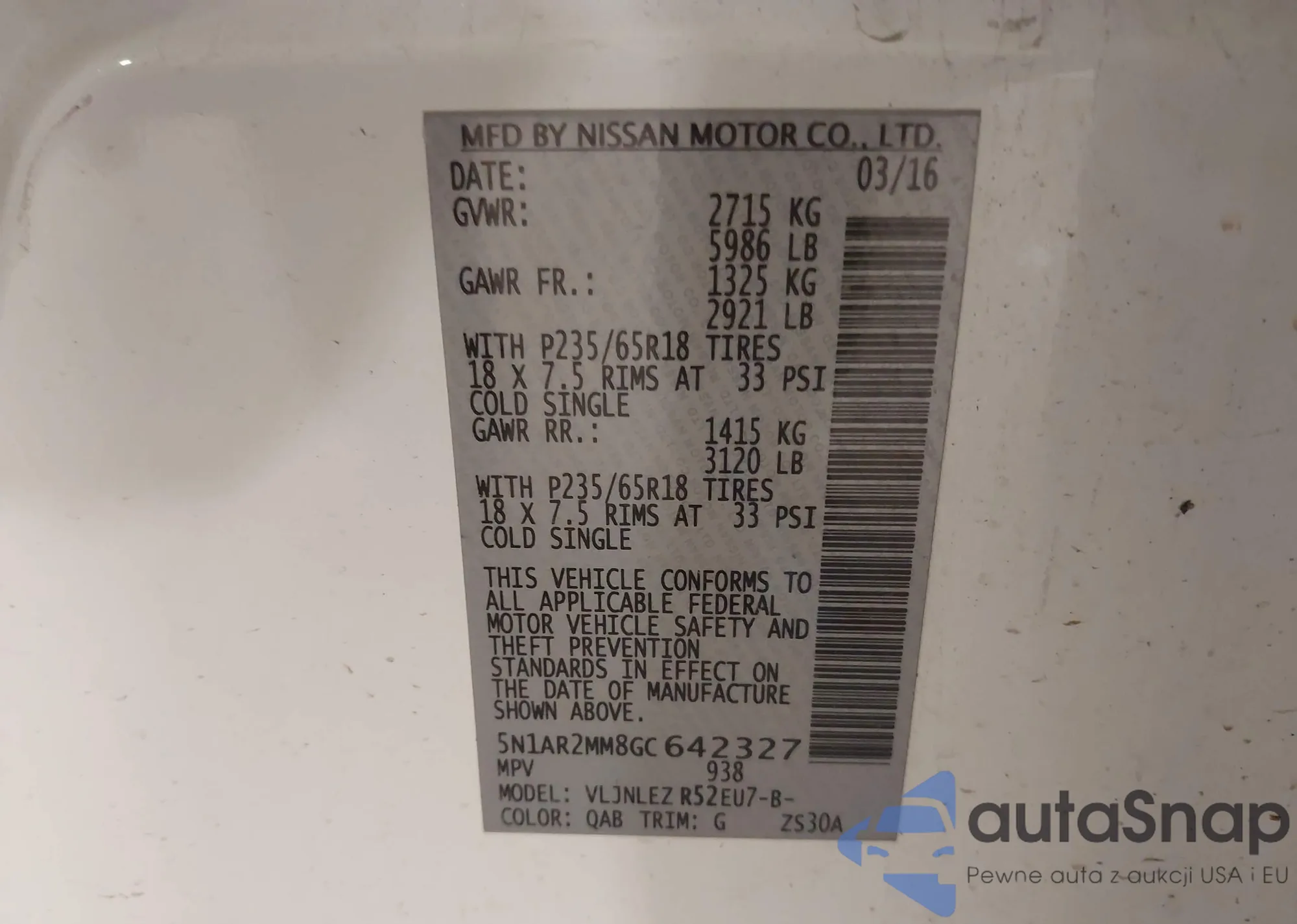 LOT: 43599508 VIN: 5N1AR2MNXGC624825