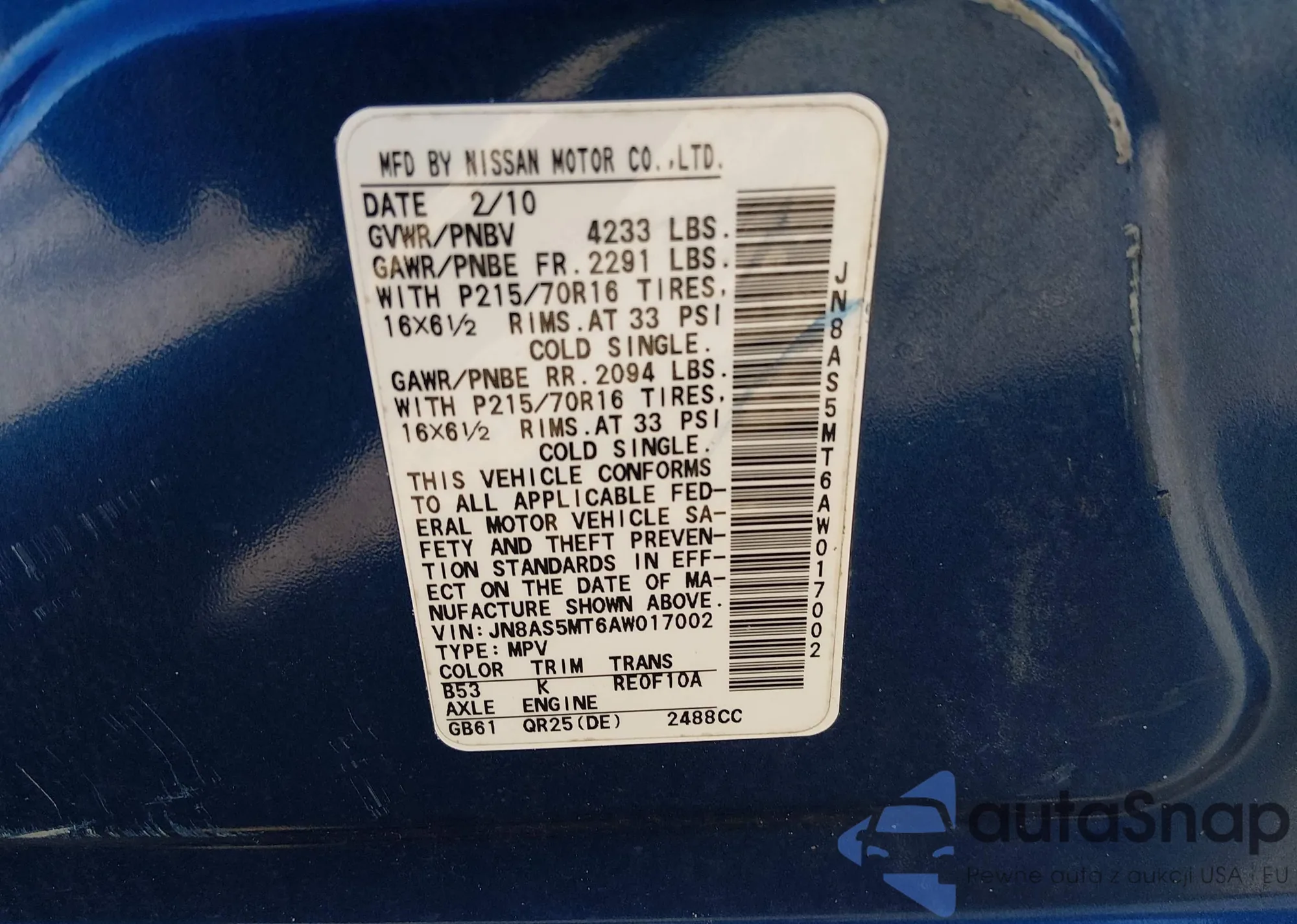 • VIN JN8AS5MT6AW017002