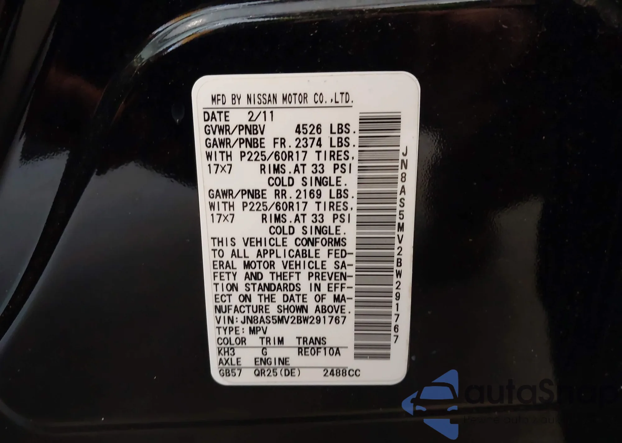 • VIN JN8AS5MV2BW291767