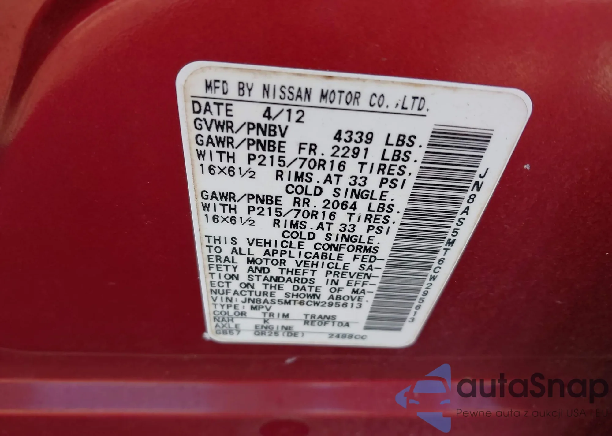 LOT: 44686039 VIN: JN8AS5MT6CW295613