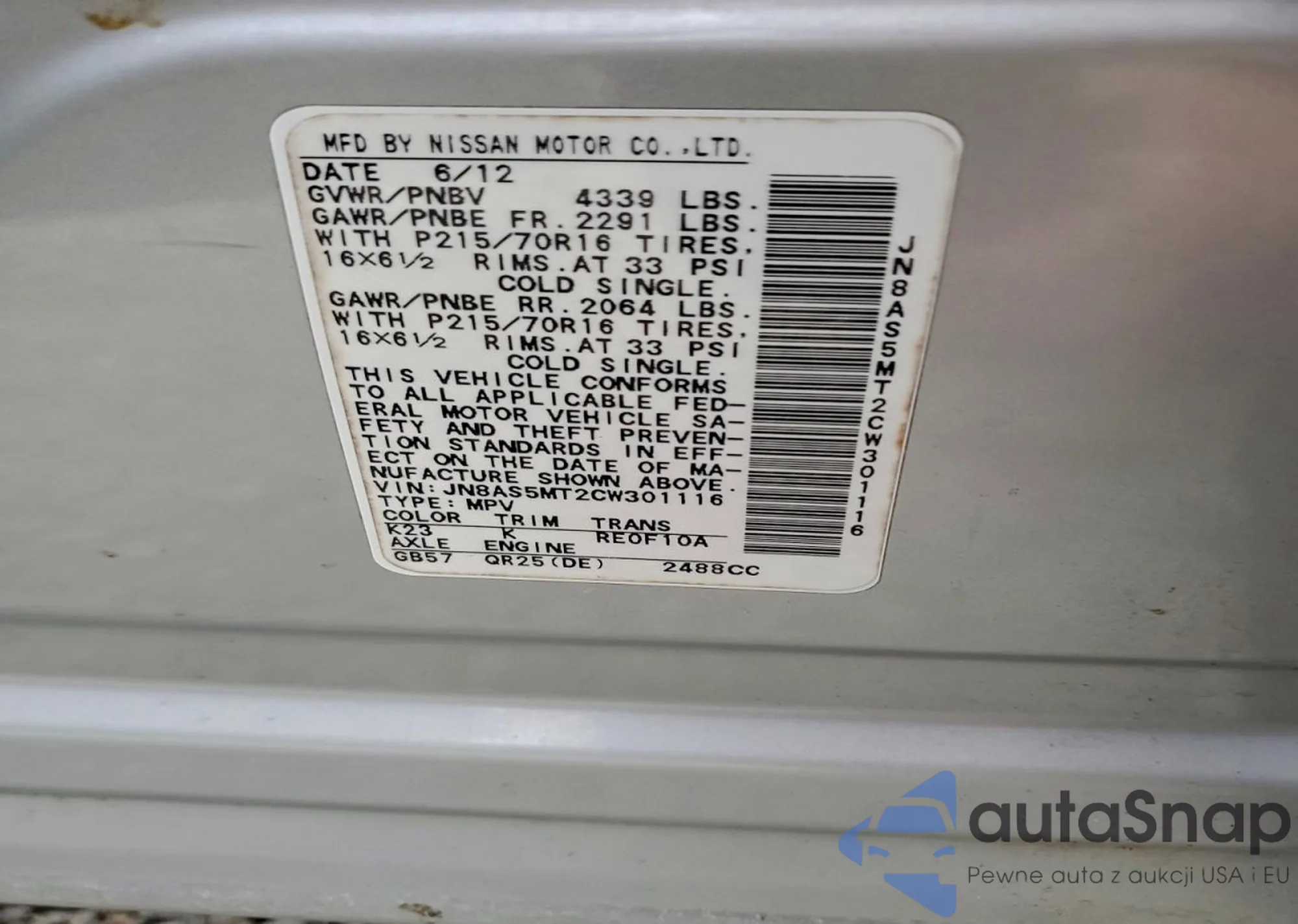 LOT: 95109405 VIN: JN8AS5MT2CW301116