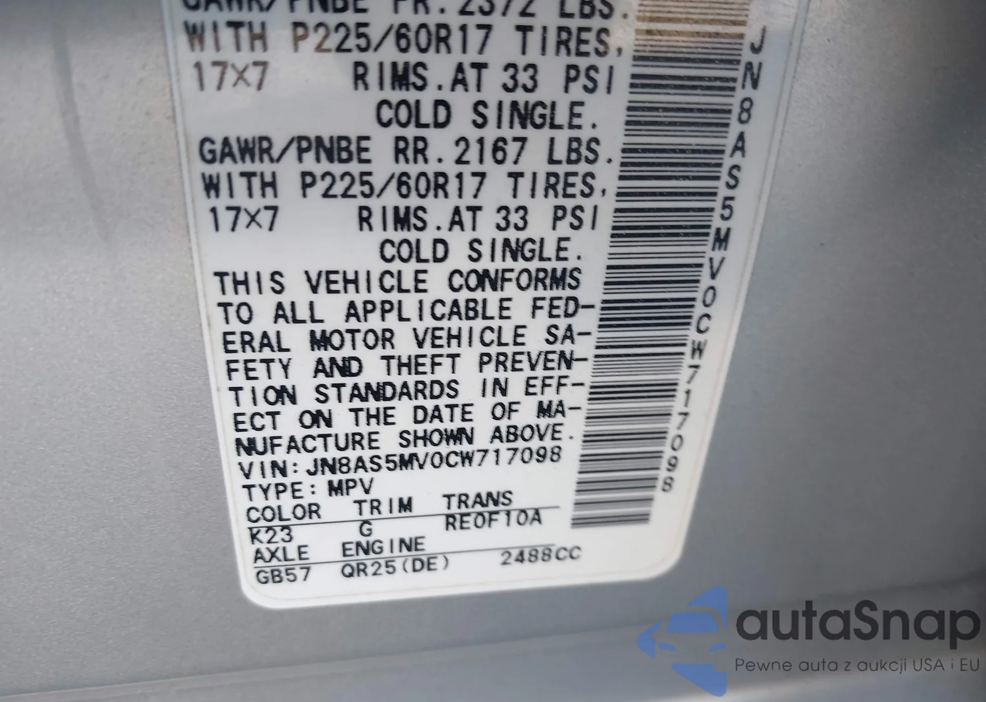 LOT: 44212722 VIN: JN8AS5MV0CW717098
