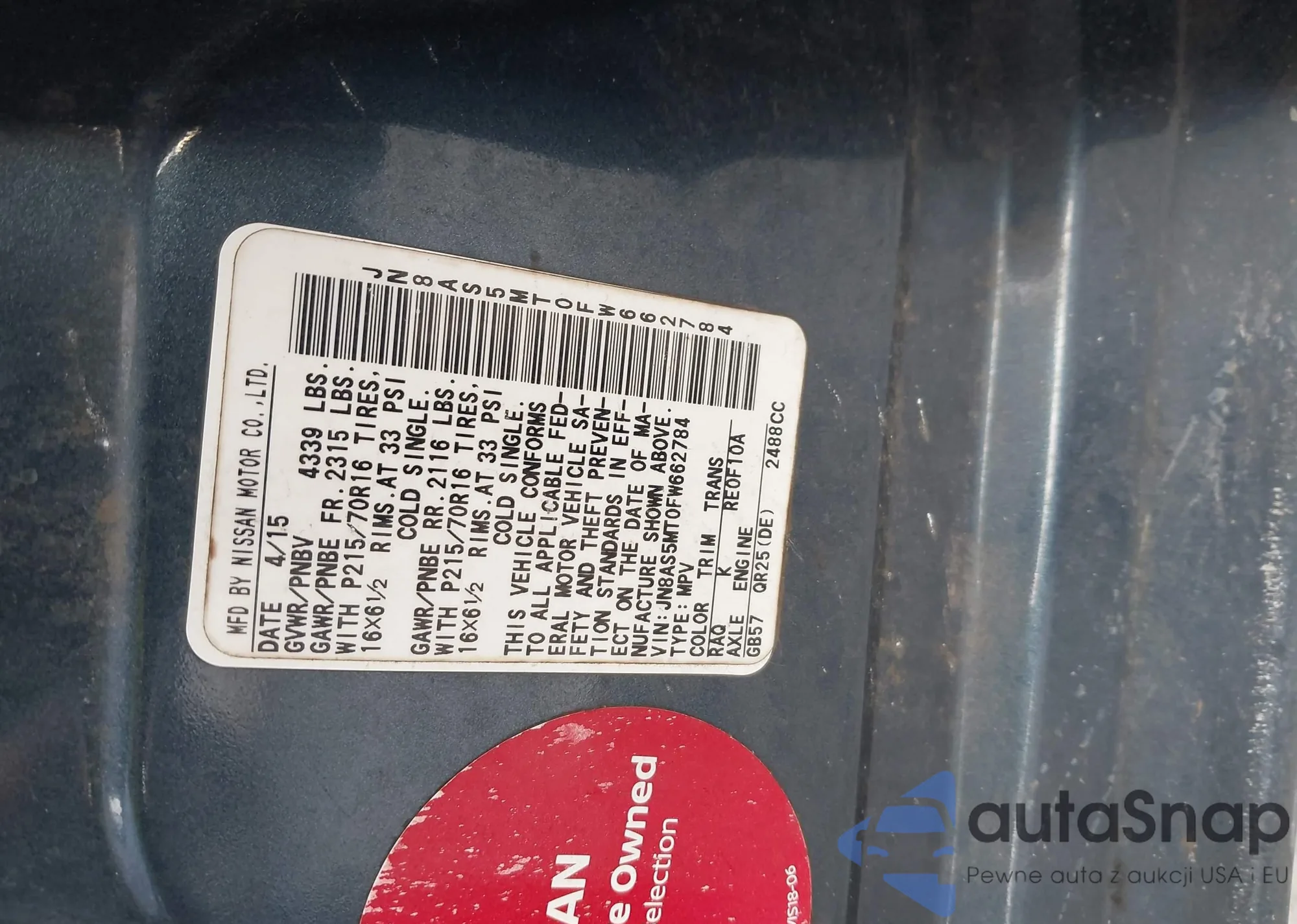 LOT: 44213577 VIN: JN8AS5MT0FW662784