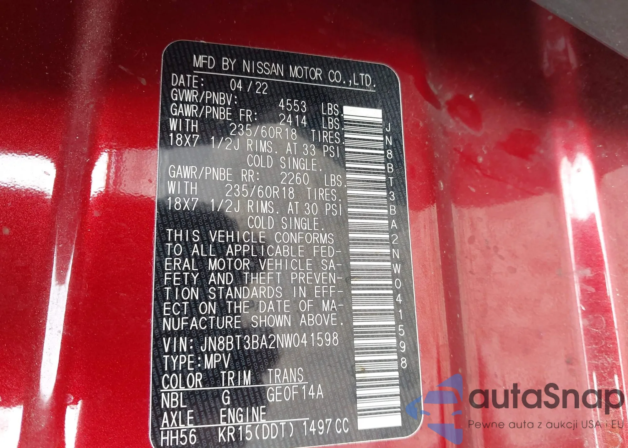 LOT: 44230485 VIN: JN8BT3BA2NW041598