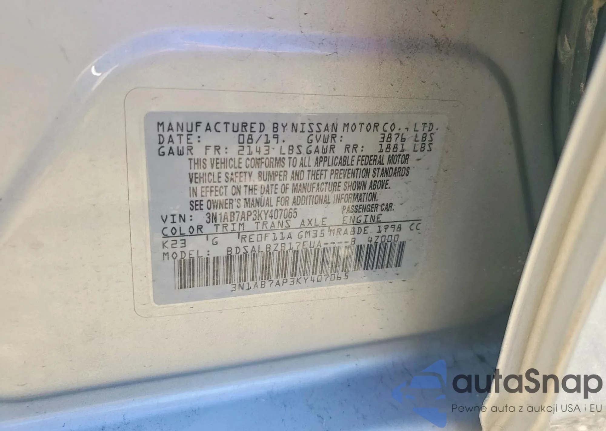 LOT: 72621955 VIN: 3N1AB7AP3KY407065