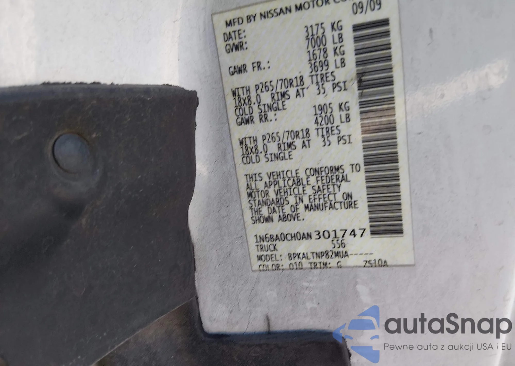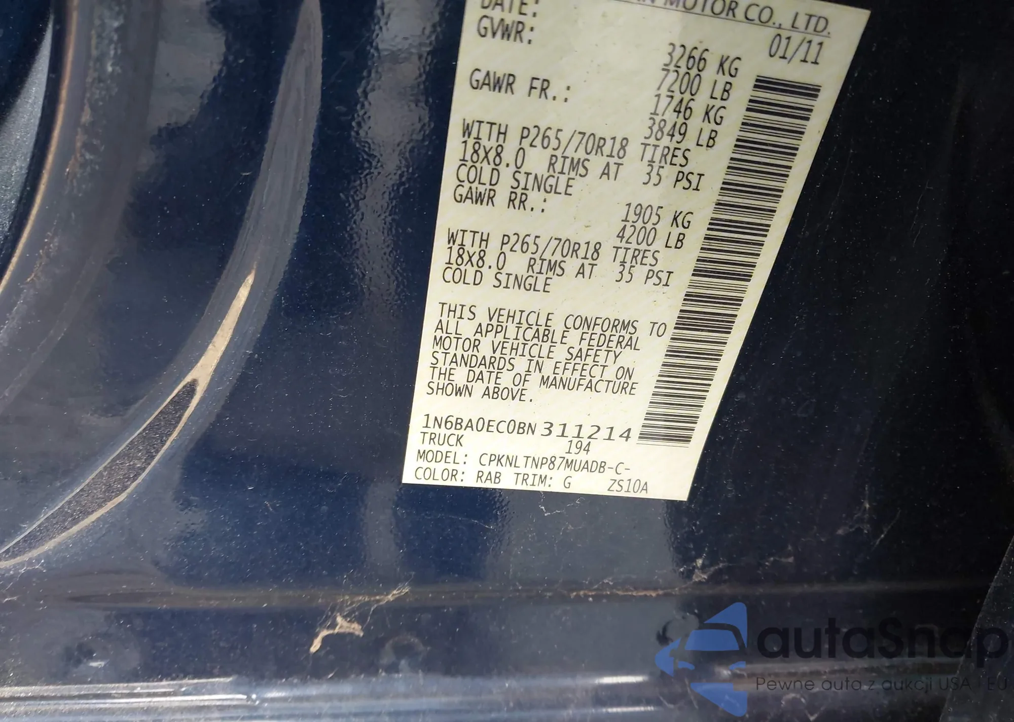 • VIN 1N6AA0EJ5BN309727