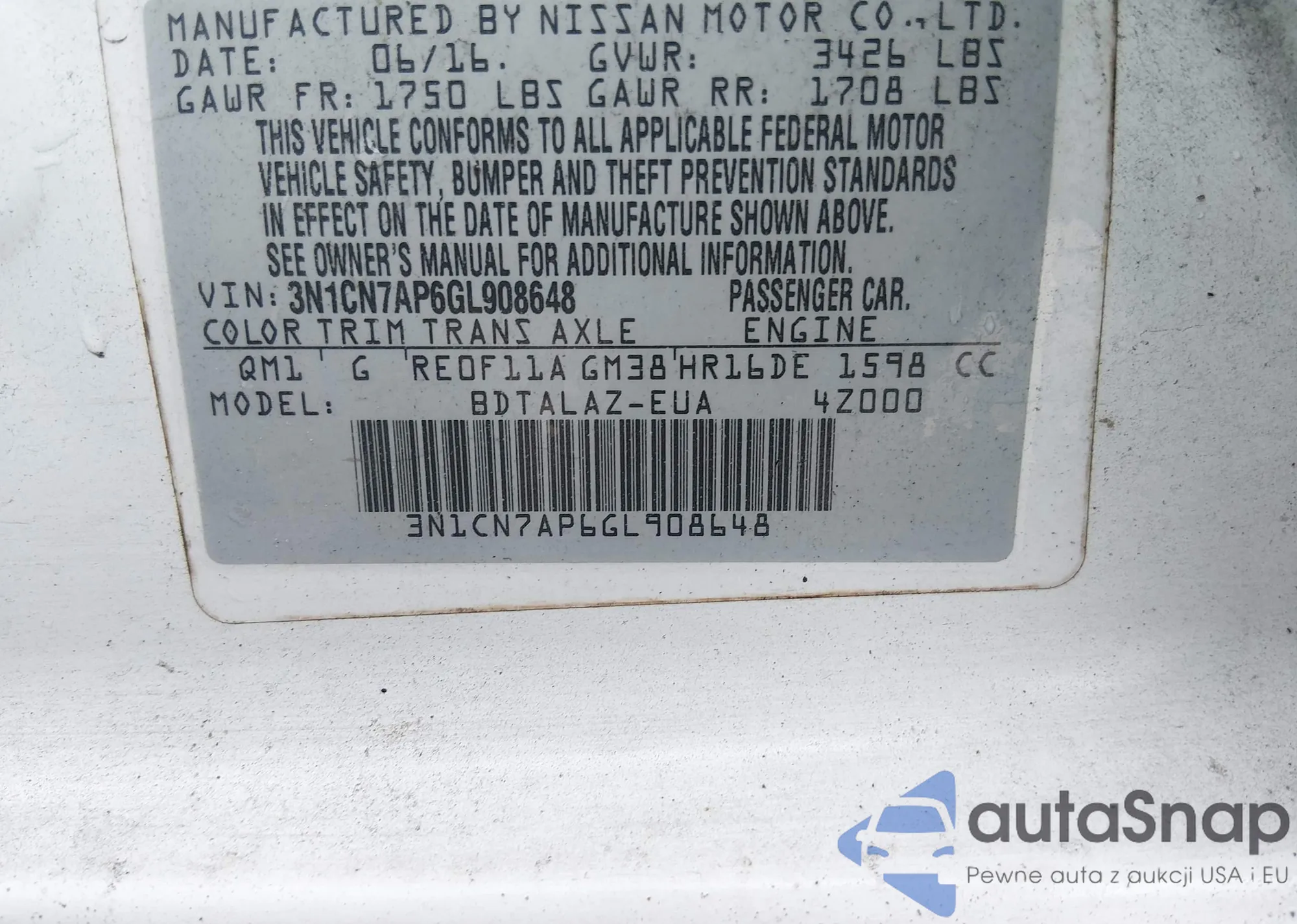 • VIN 3N1CN7AP6GL908648
