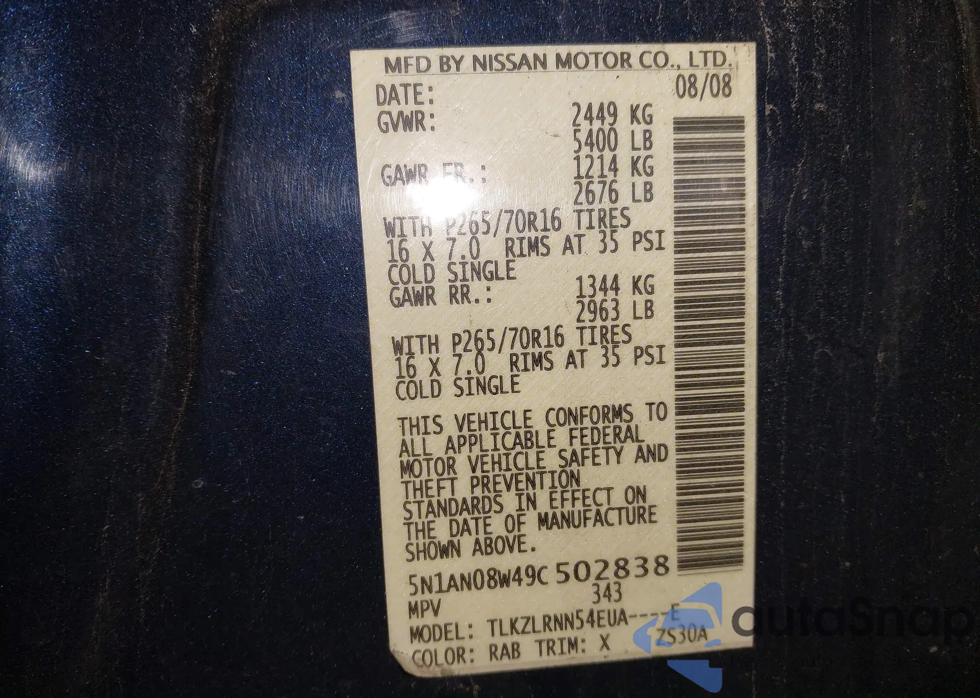 • VIN 5N1AN08W49C502838