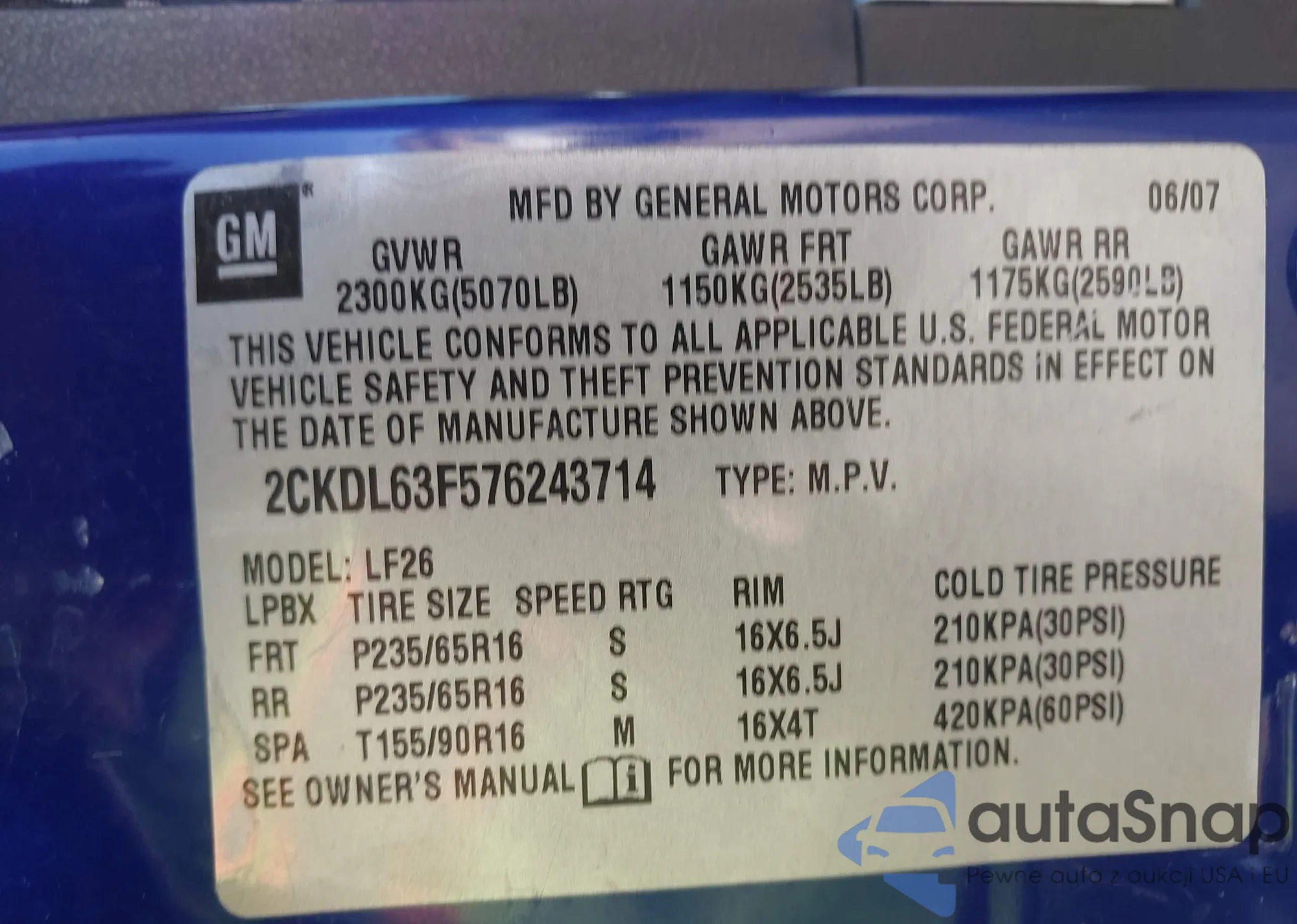 • VIN 2CKDL63F576243714