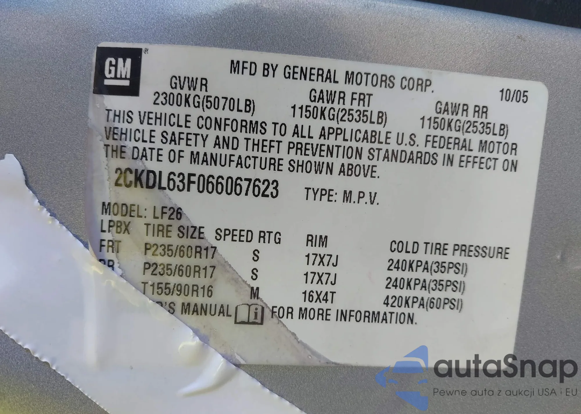 LOT: 44256309 VIN: 2CKDL63F066067623