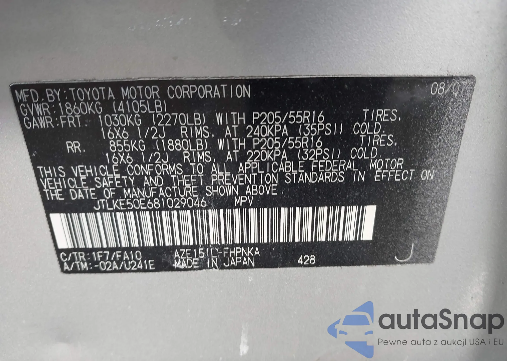 LOT: 44208063 VIN: JTLKE50E681029046