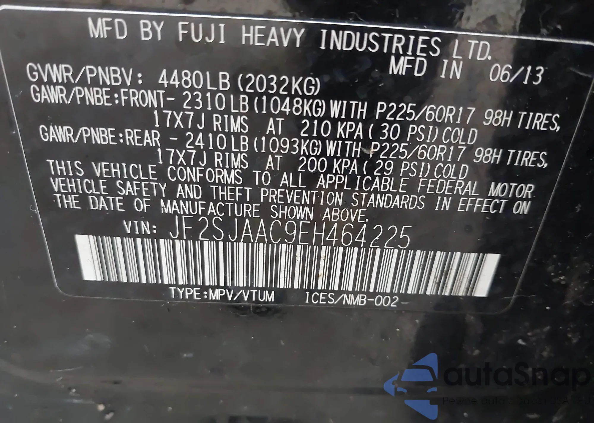 LOT: 44092513 VIN: JF2SJAAC6EH435006