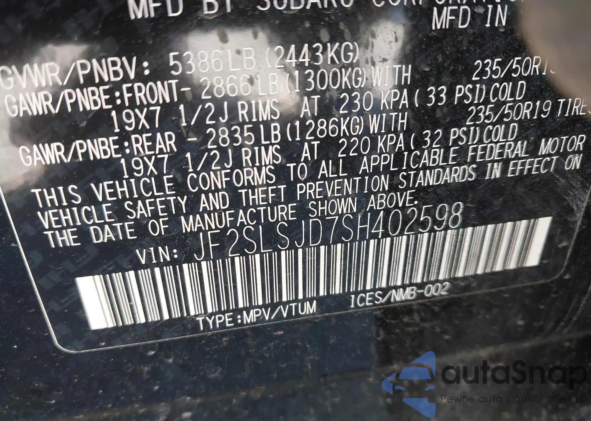 • VIN JF2SLSJD7SH402598