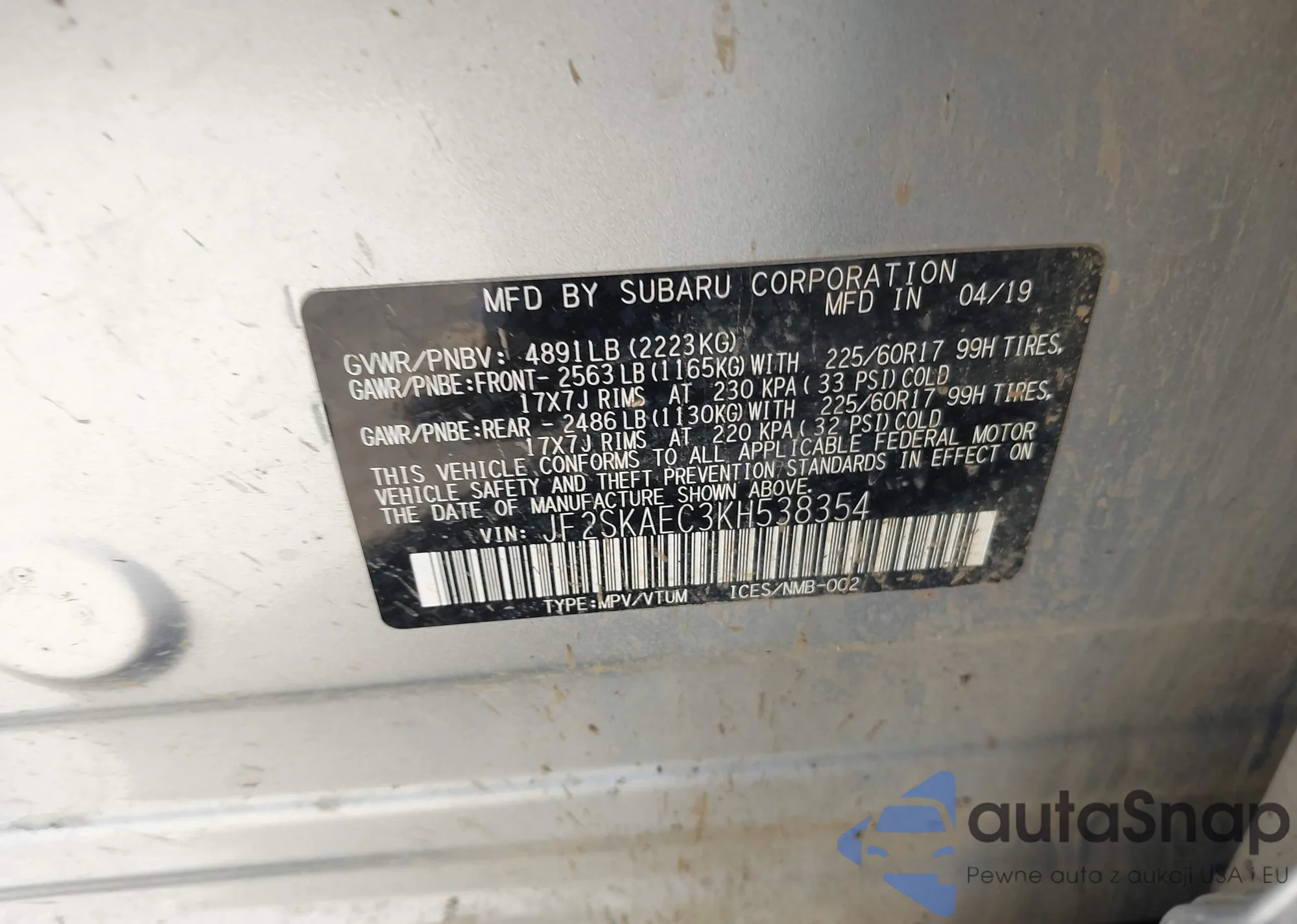 LOT: 44167778 VIN: JF2SKAEC3KH538354