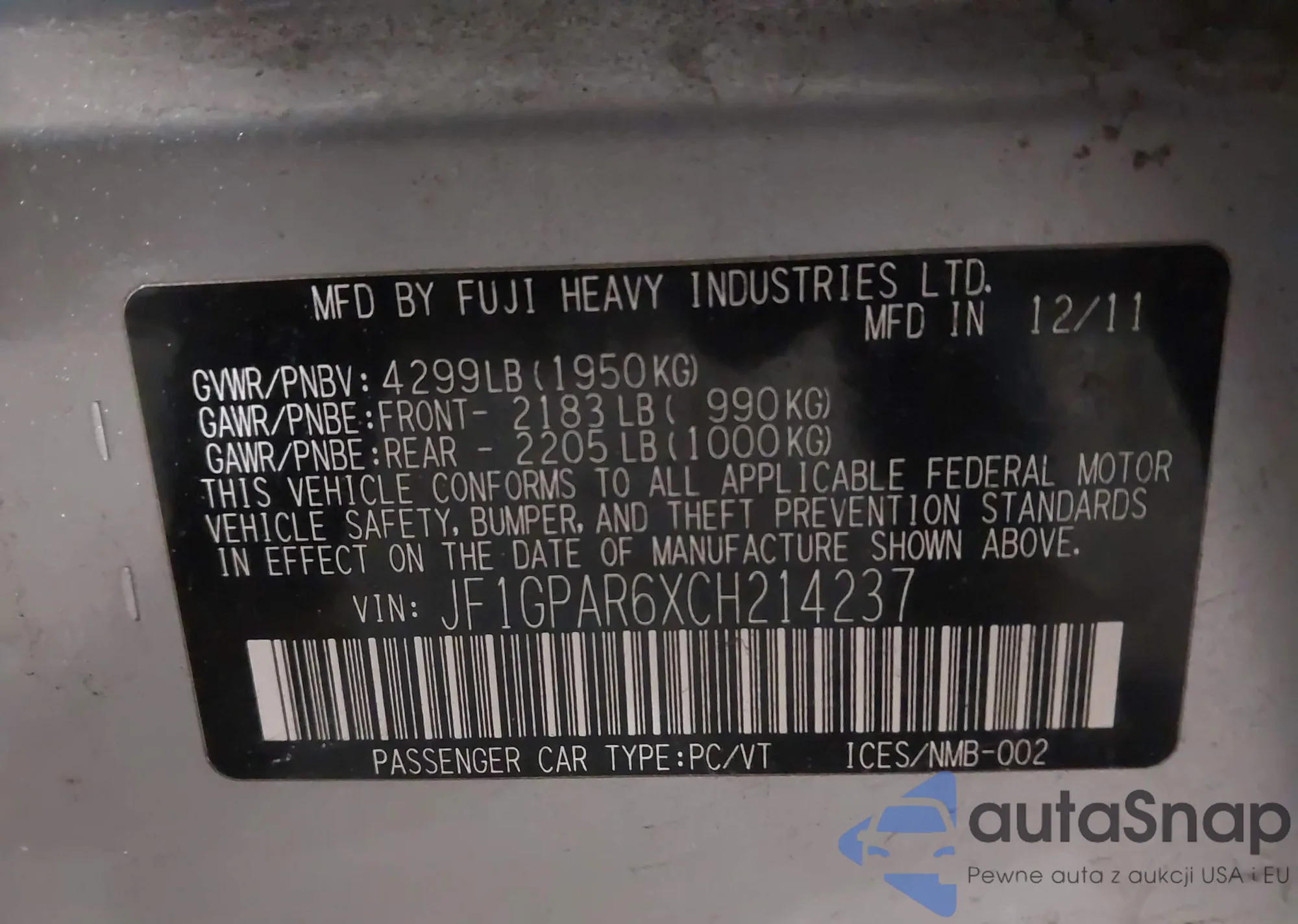 LOT: 44230729 VIN: JF1GPAR6XCH214237