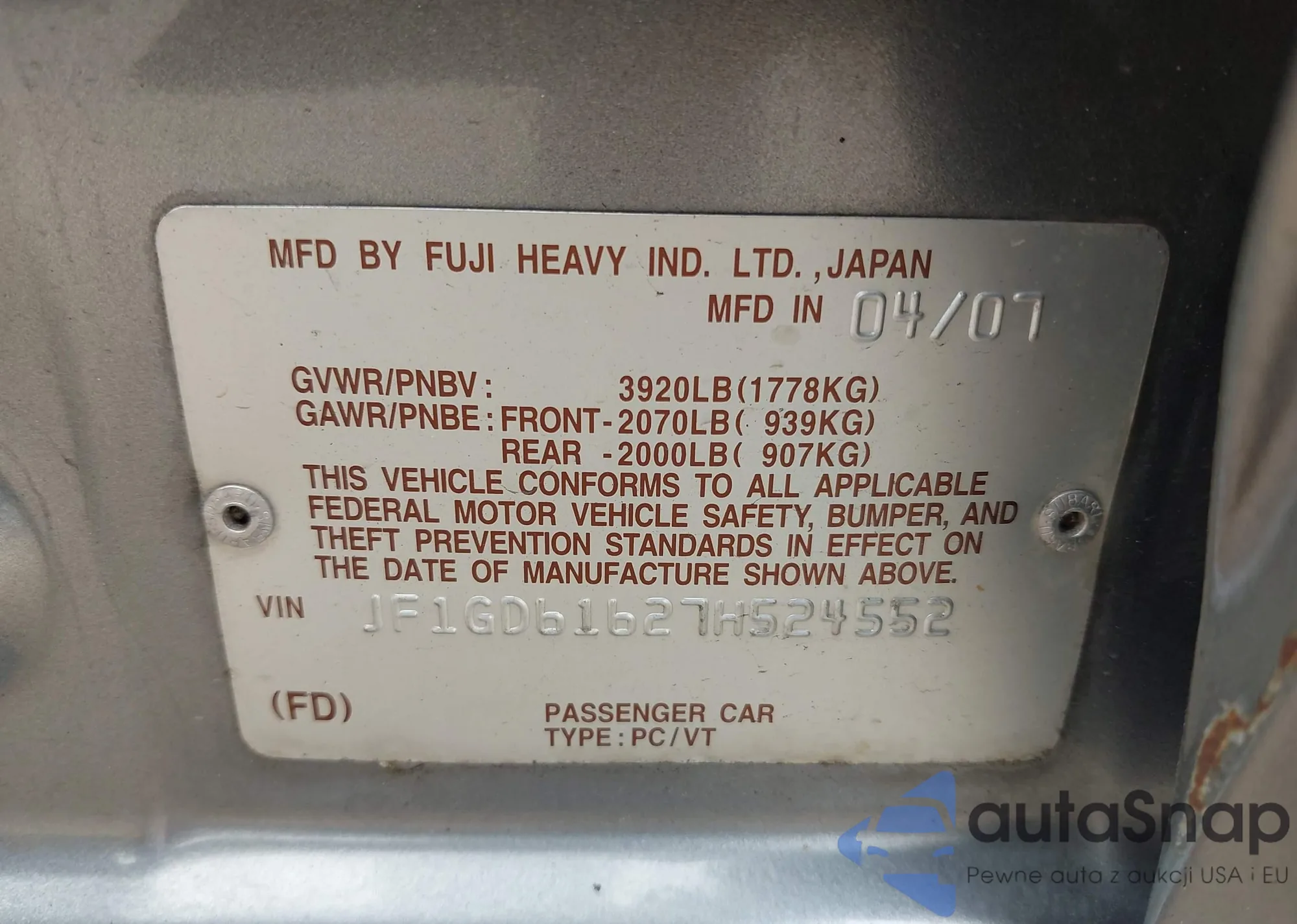 LOT: 42386195 VIN: JF1GD61627H524552