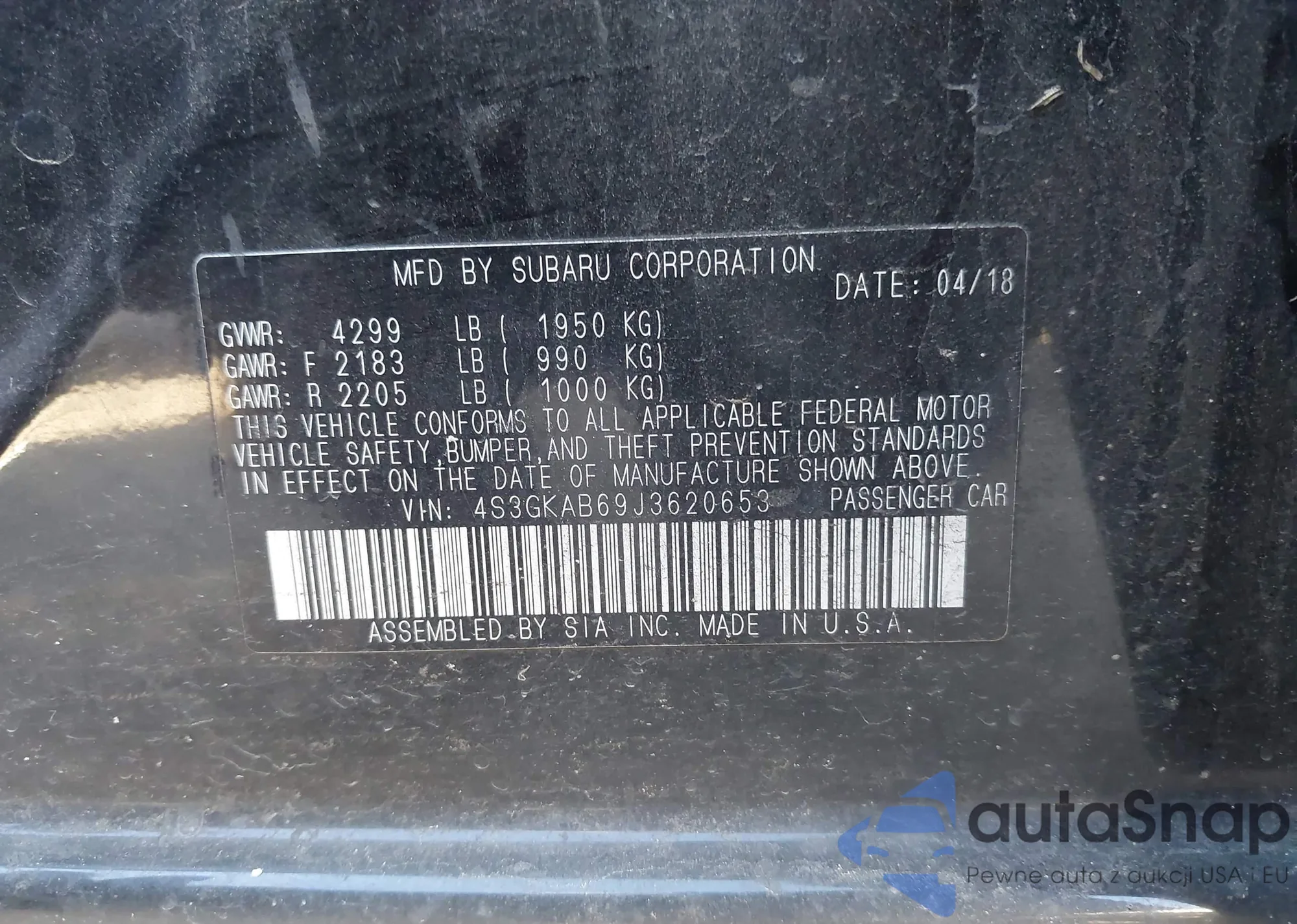 • VIN 4S3GTAL60J3740174