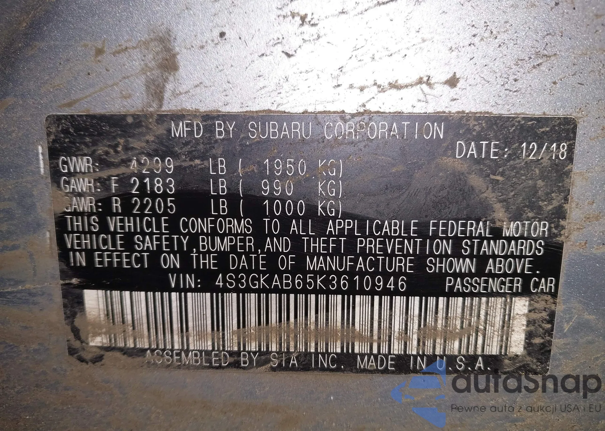 • VIN 4S3GKAB65K3610946