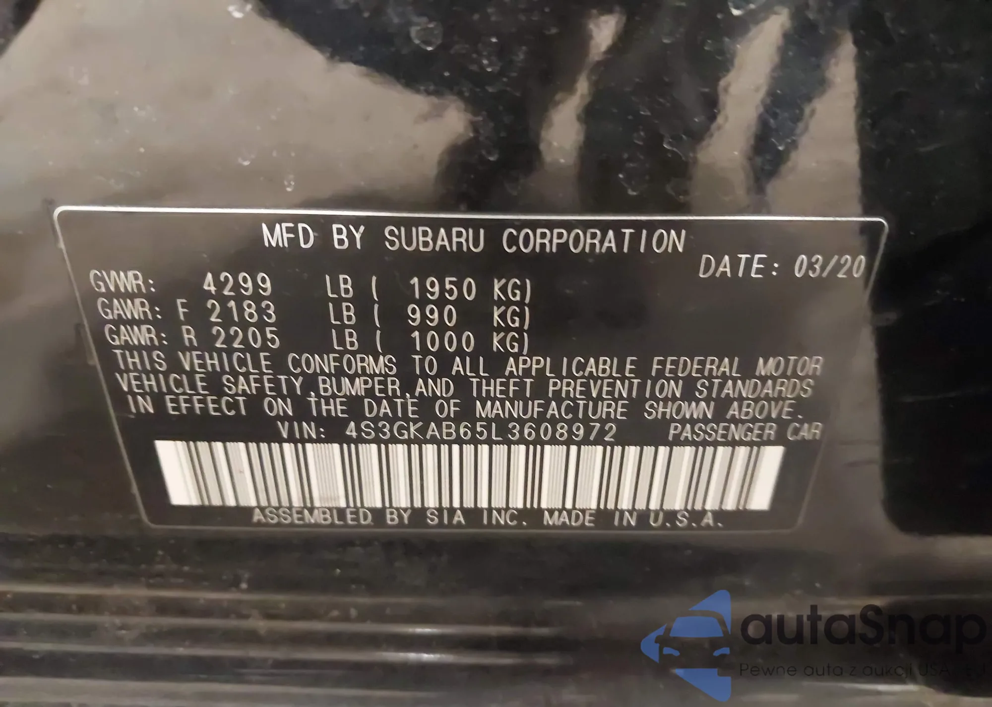 LOT: 44168647 VIN: 4S3GKAB65L3608972