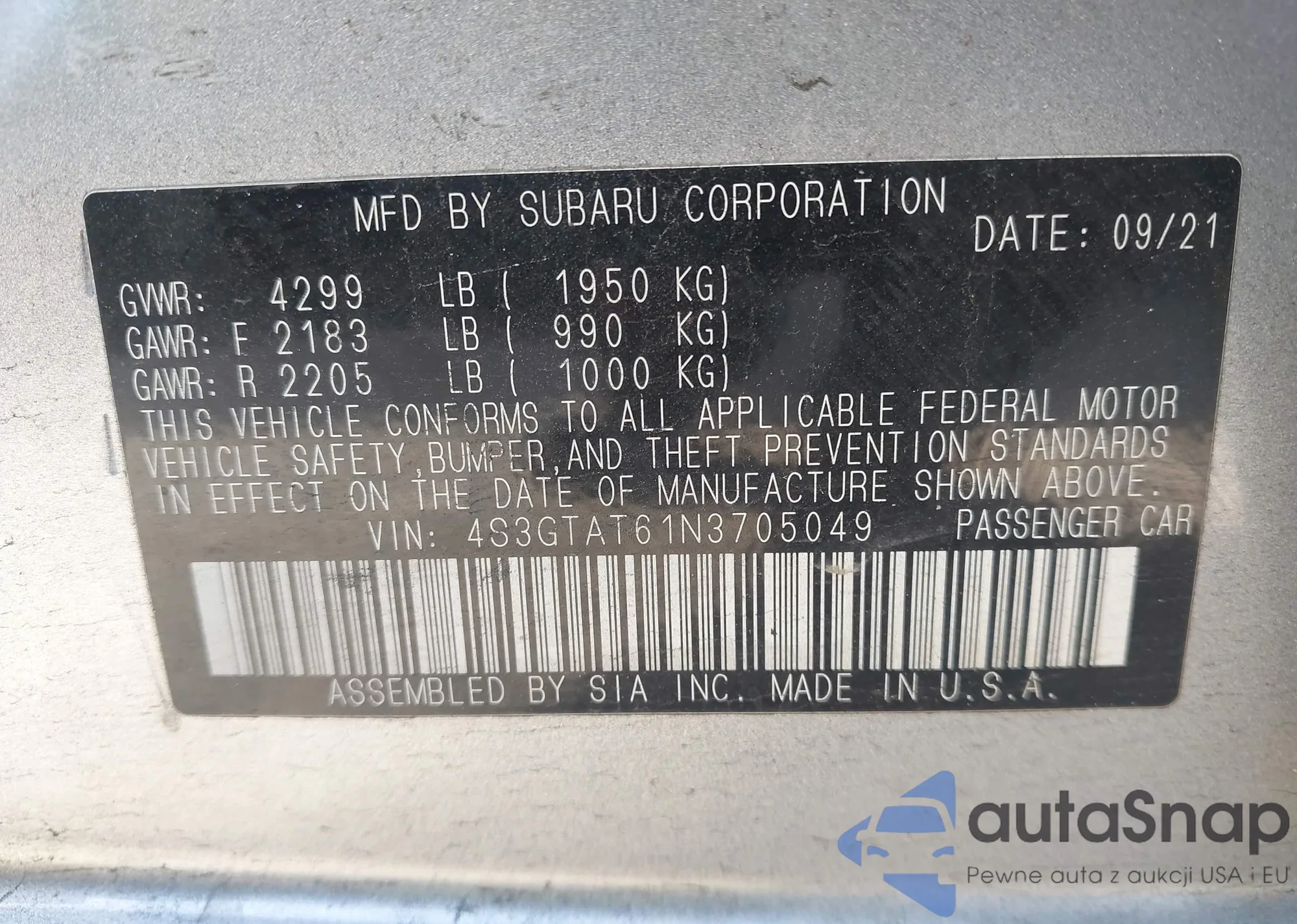 • VIN 4S3GTAT61N3705049