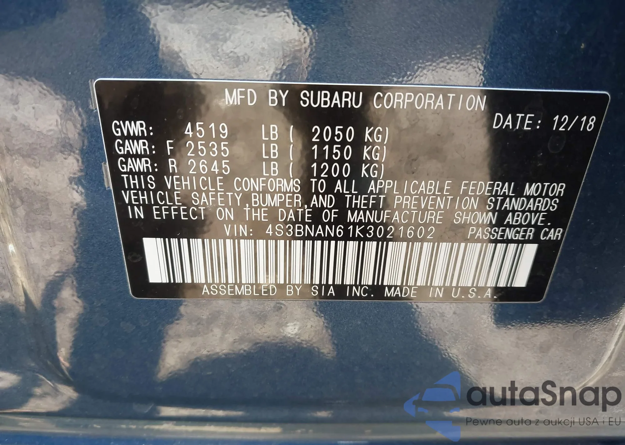 • VIN 4S3BNAN61K3021602