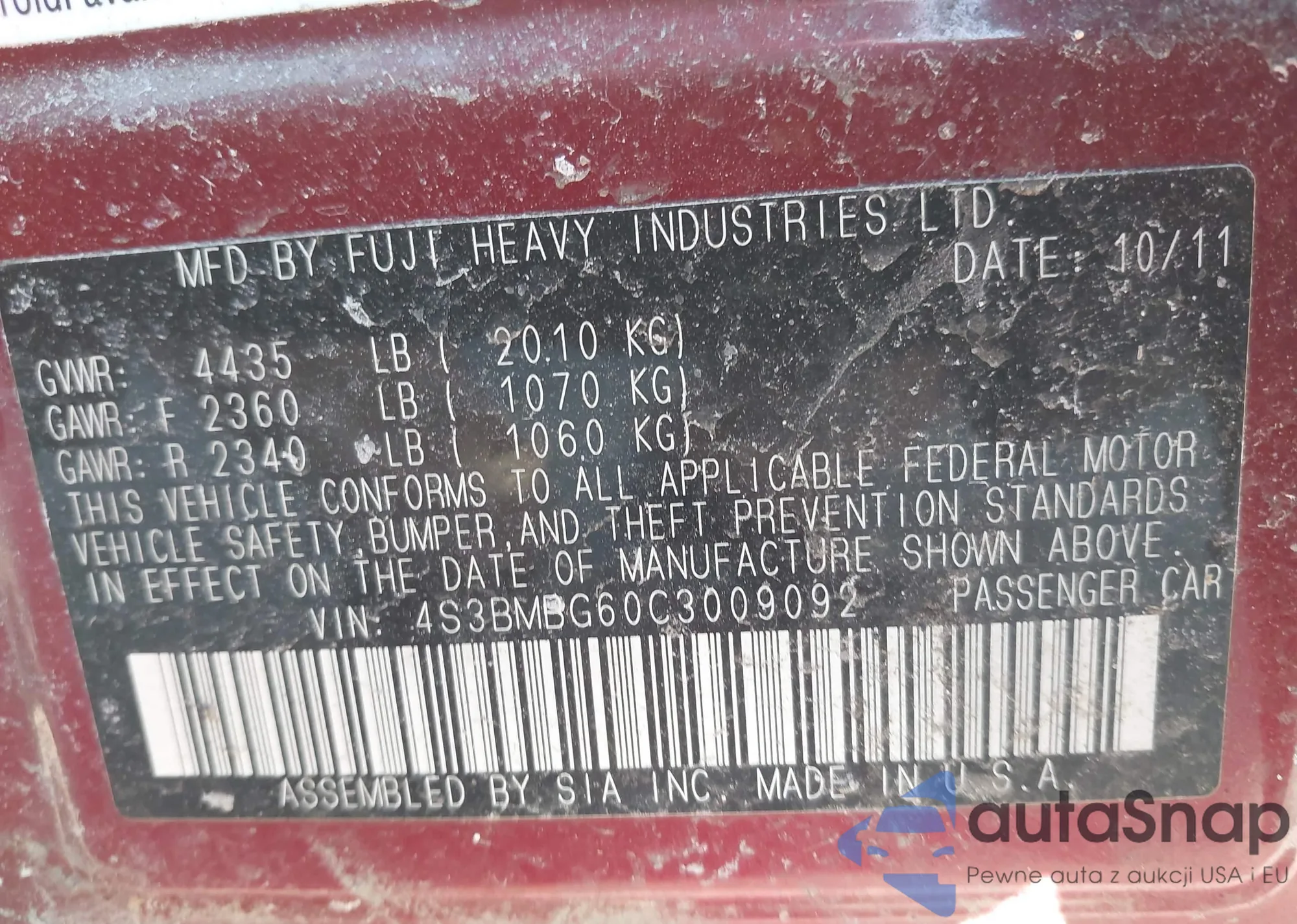 • VIN 4S3BMBG60C3009092