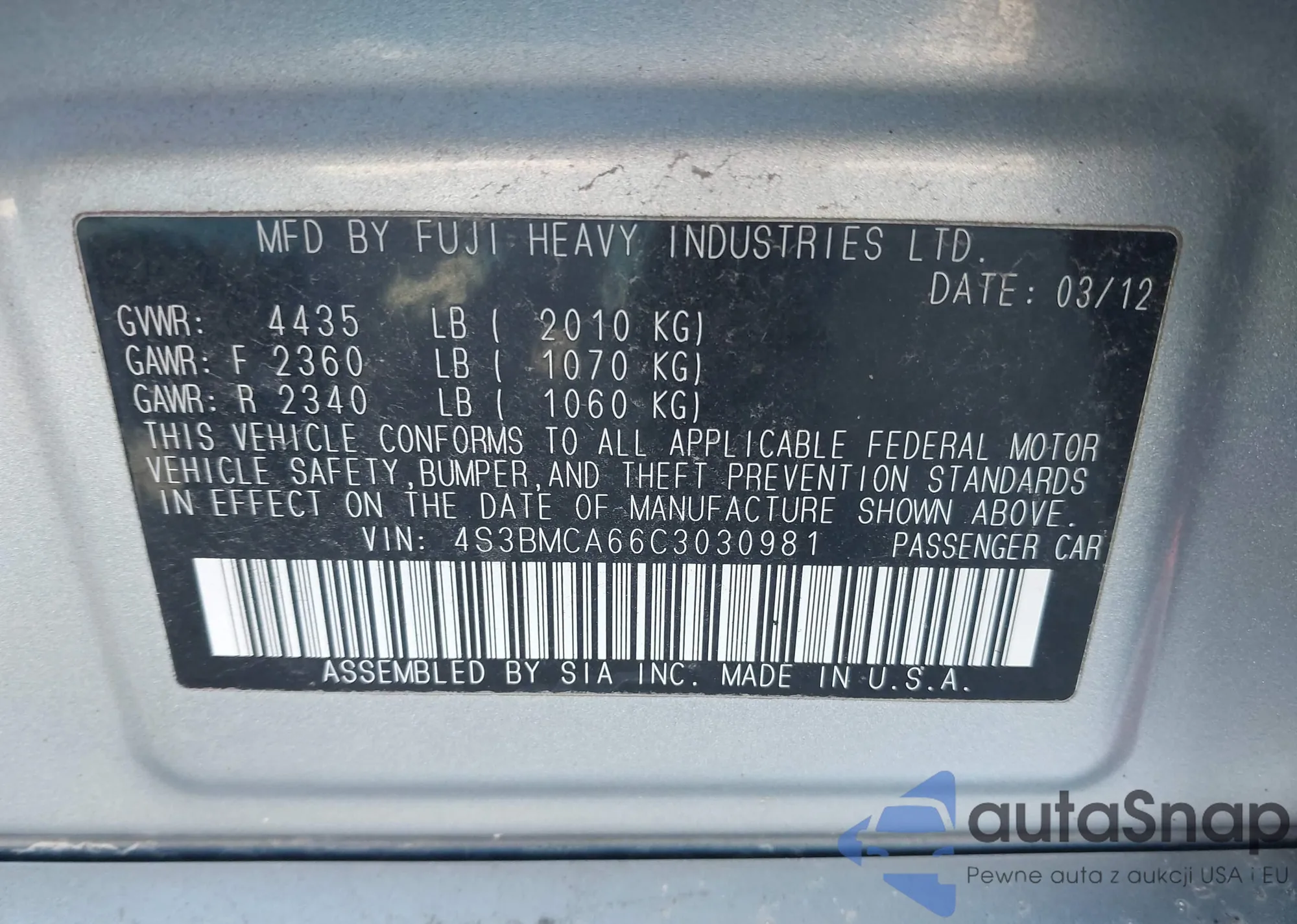 • VIN 4S3BMCA66C3030981
