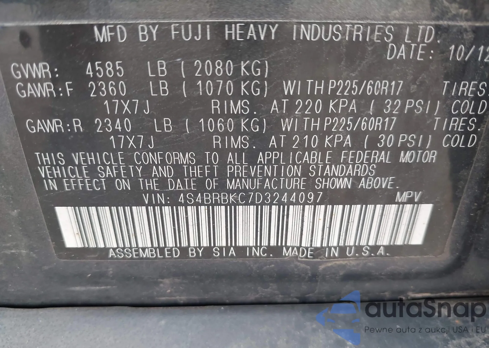 LOT: 44016915 VIN: 4S4BRBKC7D3244097