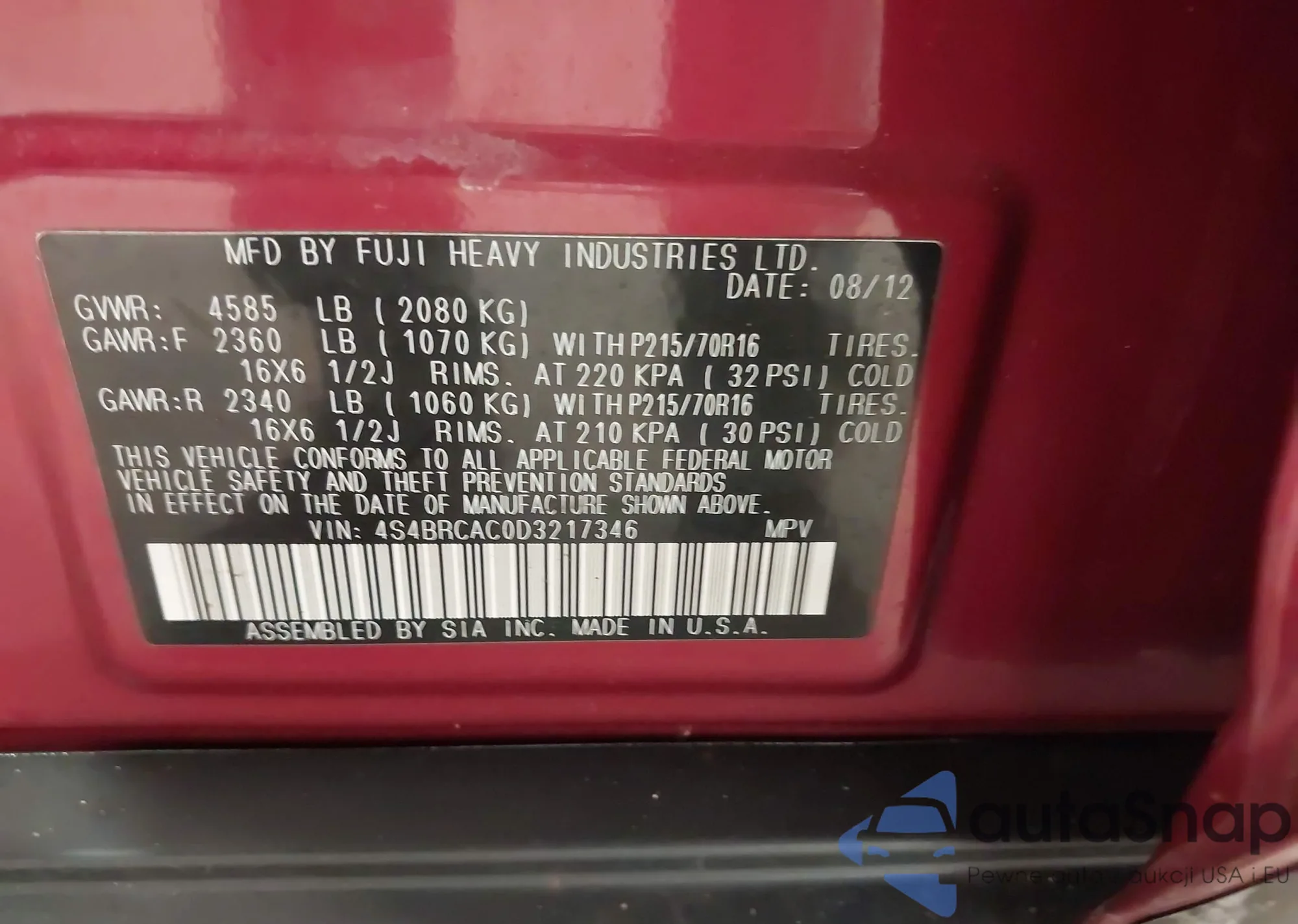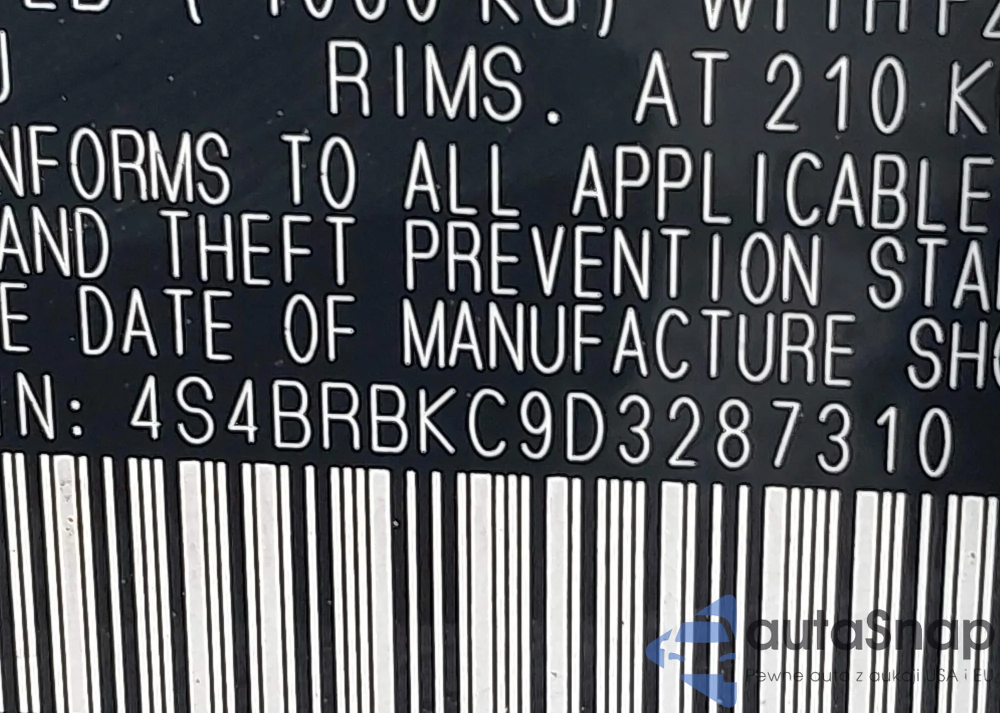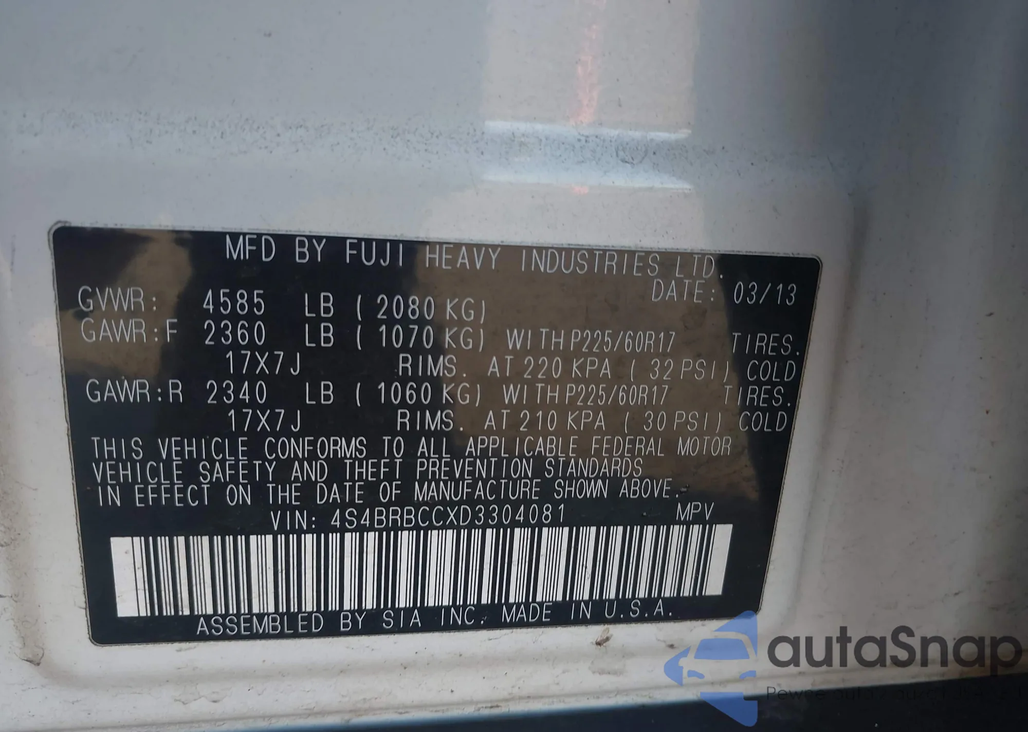 LOT: 43963474 VIN: 4S4BRCAC0D3217346