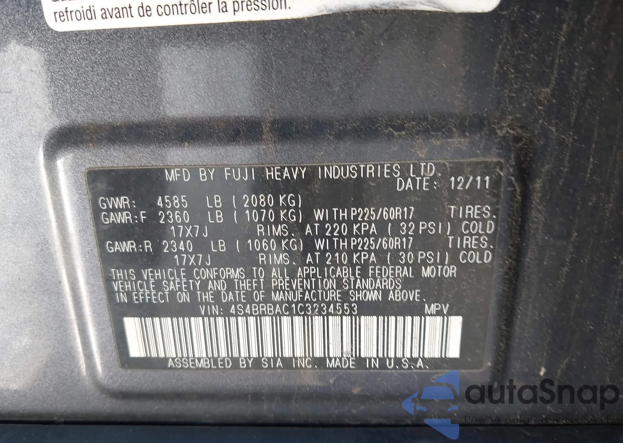 LOT: 44104605 VIN: 4S4BRBAC1C3234553