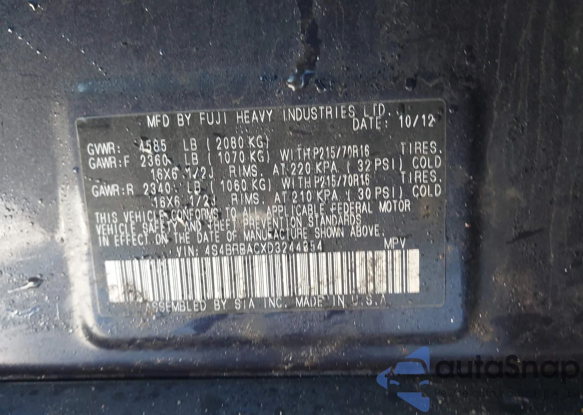 LOT: 44066792 VIN: 4S4BRBKC2D3258232