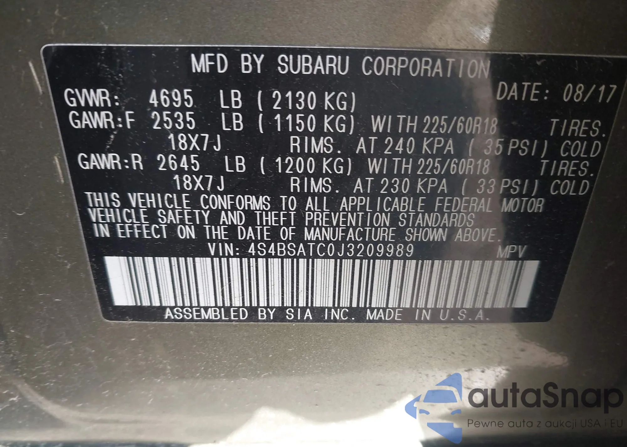 • VIN 4S4BSATC0J3209989