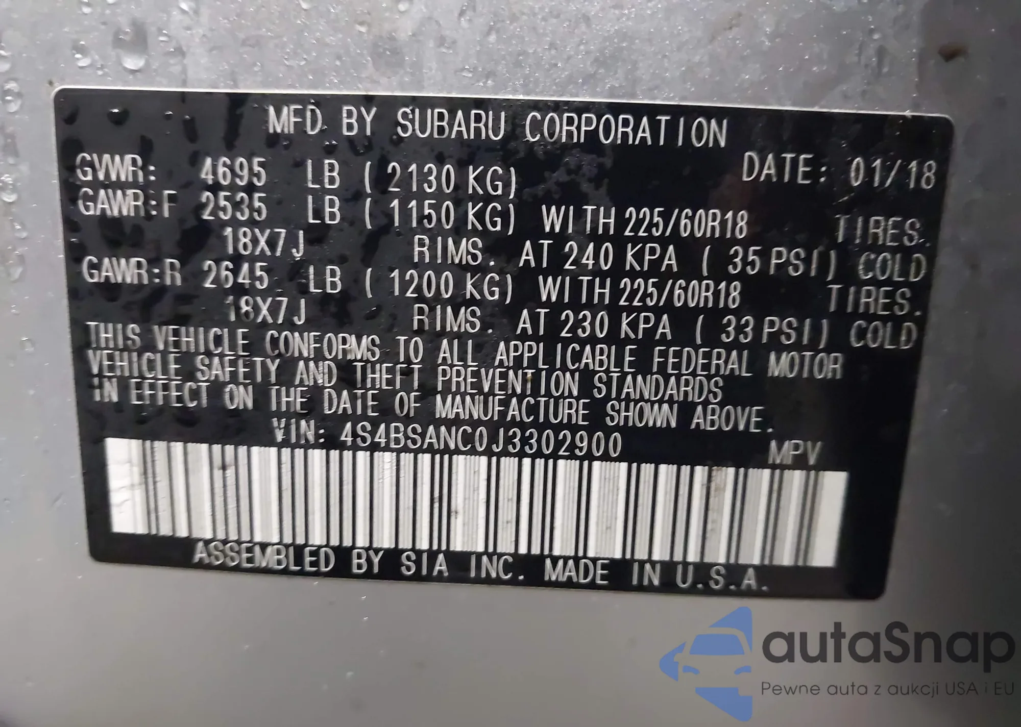 • VIN 4S4BSAAC3J3370260