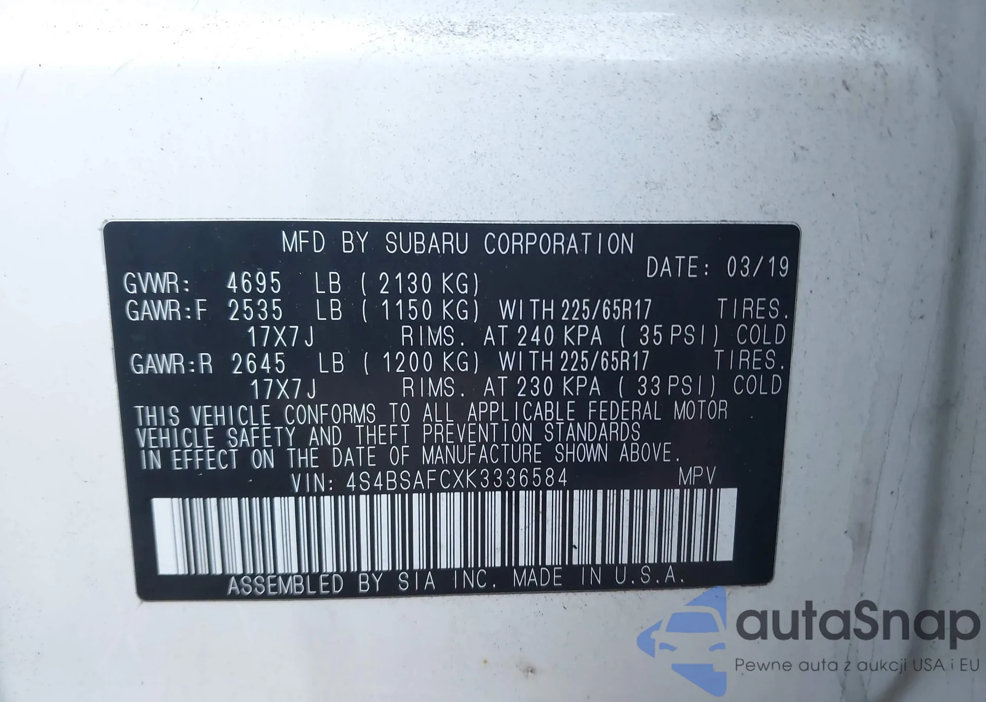 • VIN 4S4BSAFCXK3336584